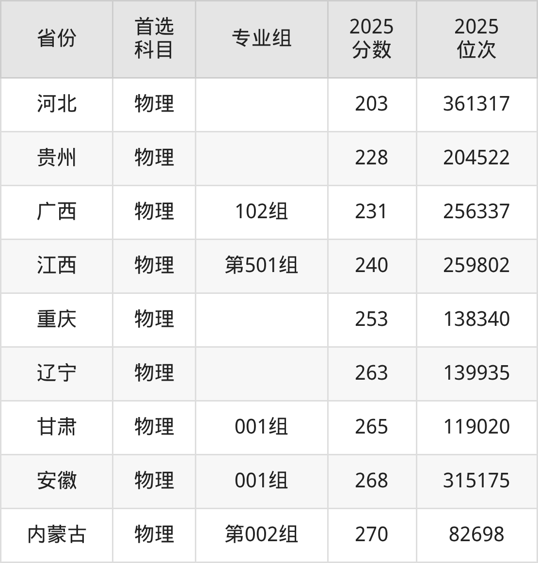 物理类最低分对应地区为四川(专业组101),录取位次为284789;最高分对应地区为内蒙古(第002组),录取位次为82698。