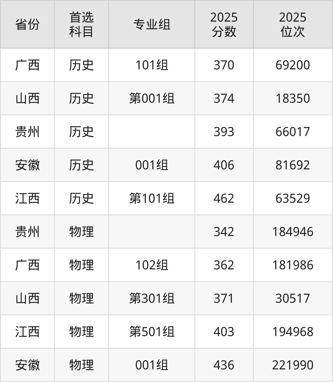 物理类最低分对应地区为贵州,录取位次为184946,超专科线162分;最高分对应地区为安徽(001组),录取位次为221990,超专科线236分。