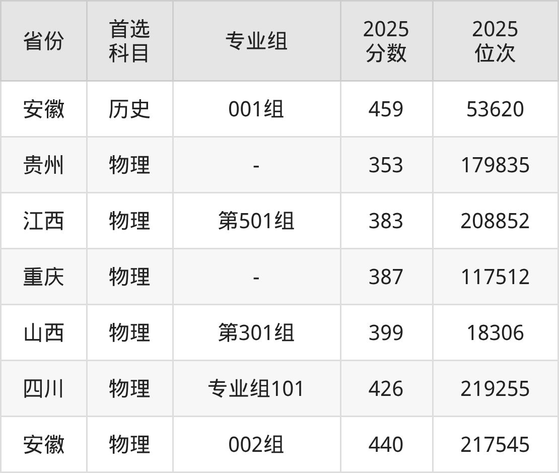 物理类最低分对应地区为贵州,录取位次为179835,超专科线173分;最高分对应地区为安徽(002组),录取位次为217545。