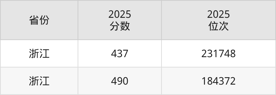 最低分对应地区为浙江,录取位次为231748,超二段线169分;最高分对应地区为浙江,录取位次为184372。