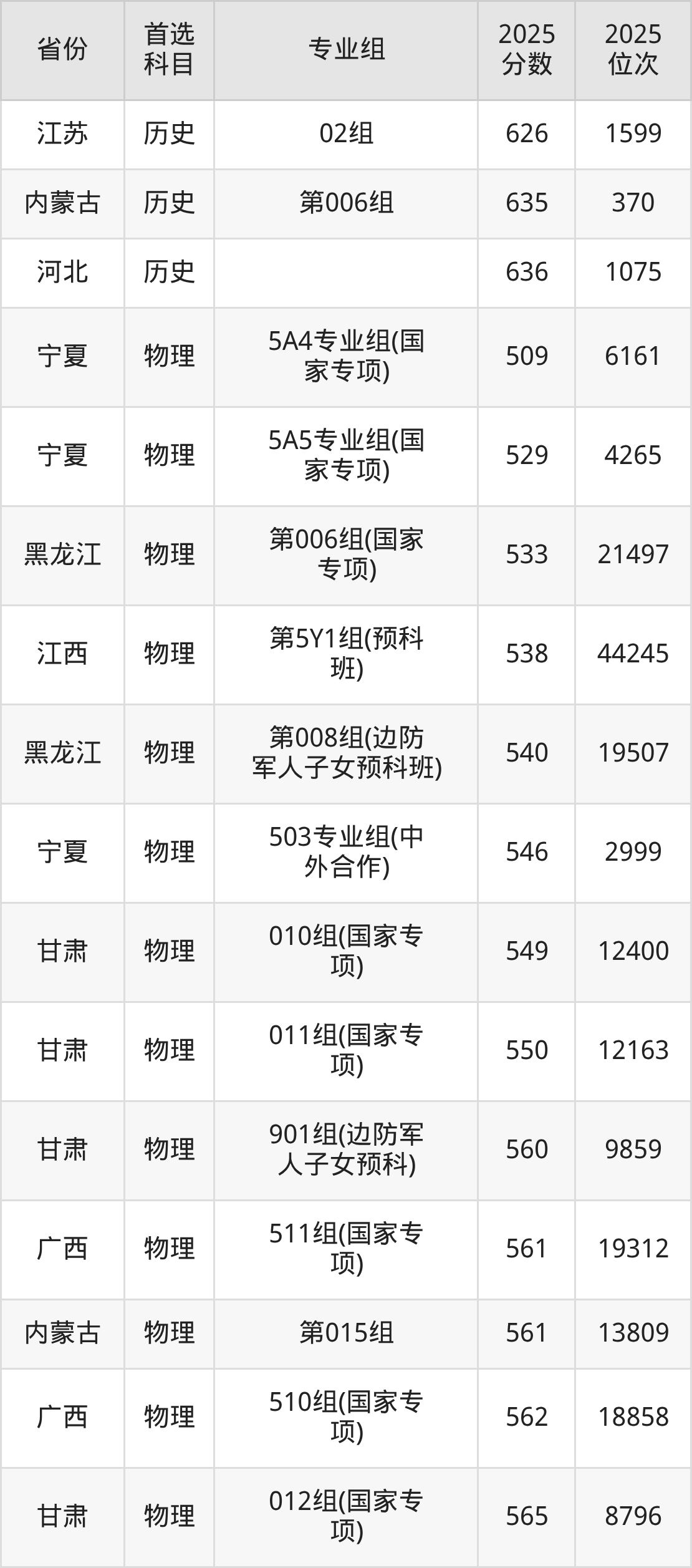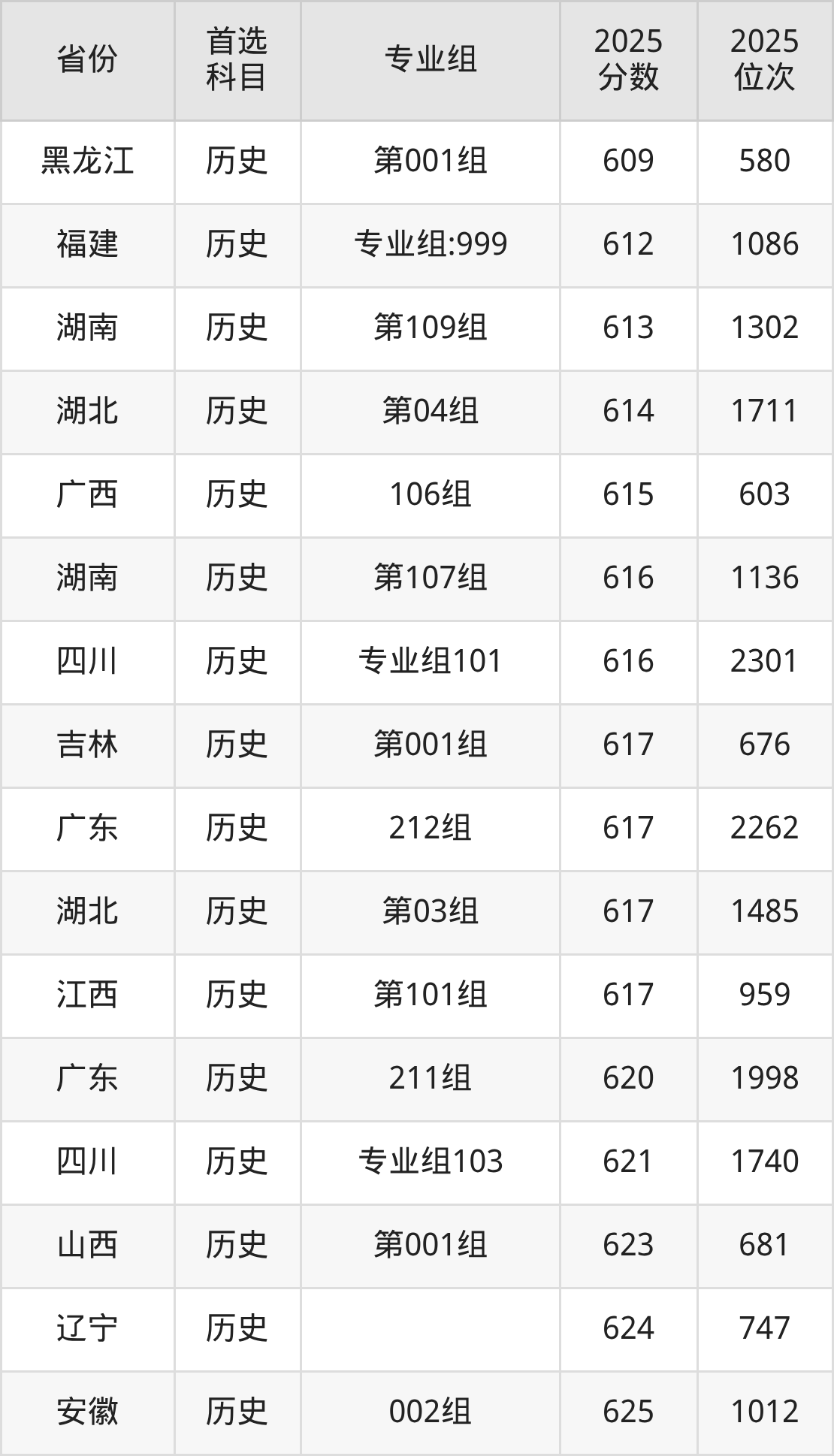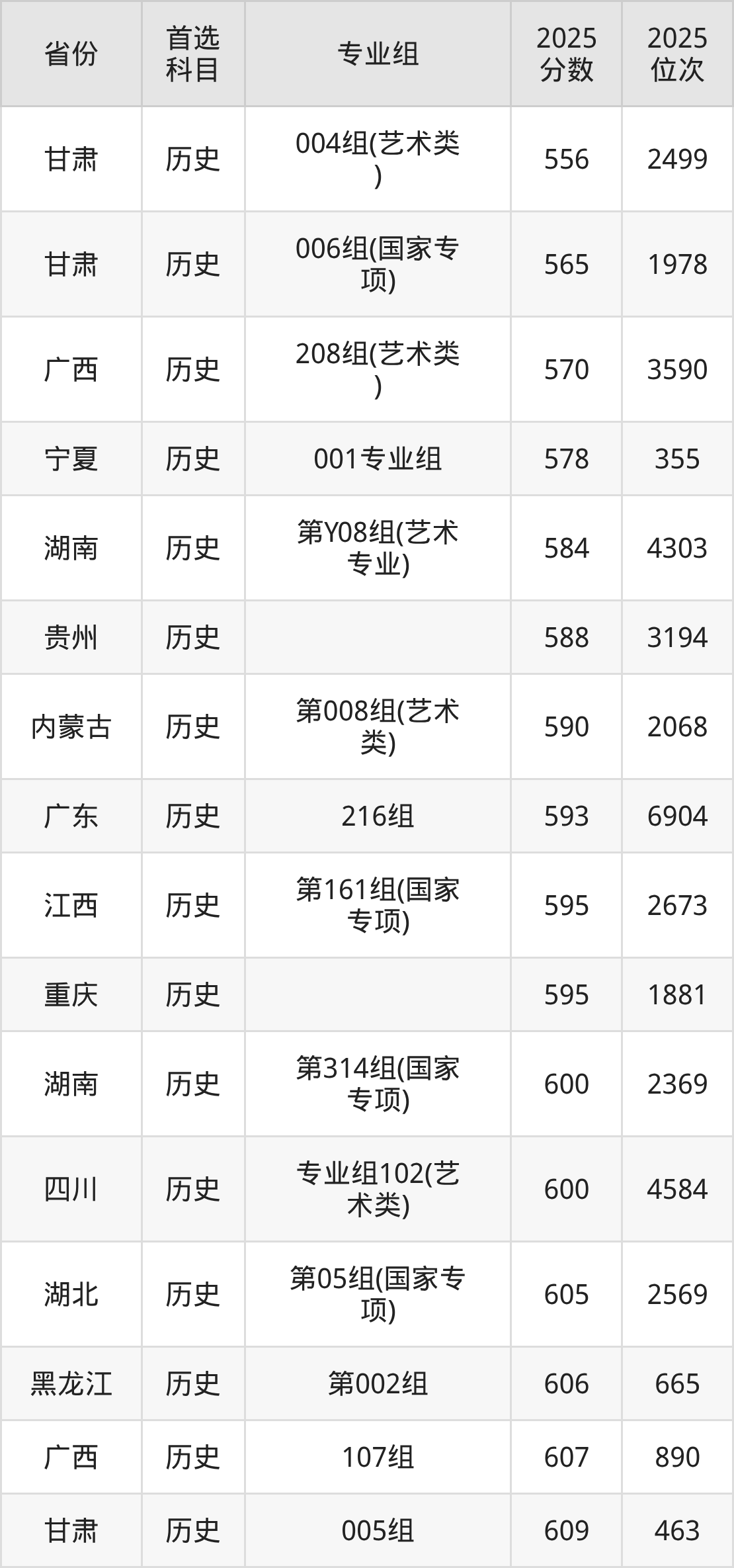 历史类最低分对应地区为甘肃(004组(艺术类)),录取位次为2499,超本科线144分;最高分对应地区为河北,录取位次为1075,超本科线159分。