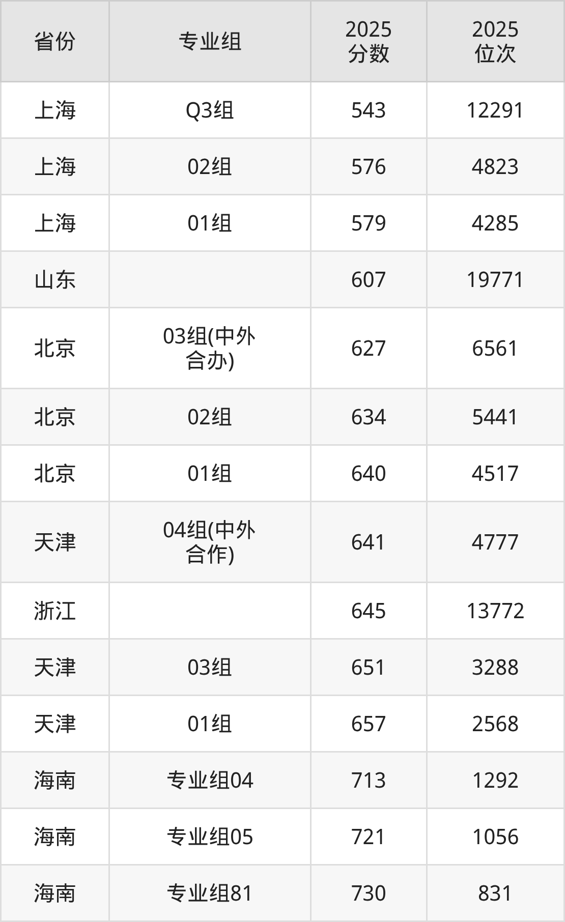 最低分对应地区为上海(Q3组),录取位次为12291,超本科线141分;最高分对应地区为海南(专业组81),录取位次为831。