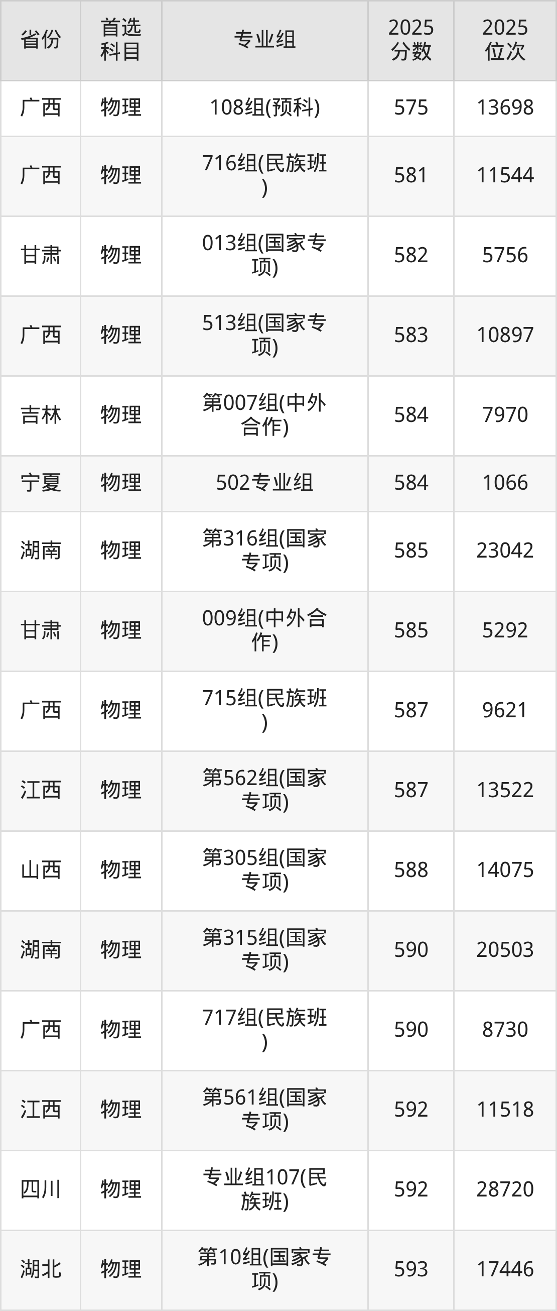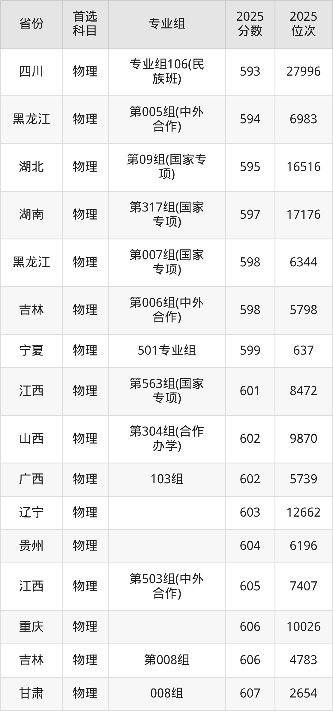 物理类最低分对应地区为宁夏(5A4专业组(国家专项)),录取位次为6161,超本科B137分;最高分对应地区为安徽(006组),录取位次为3282,超本科线192分。