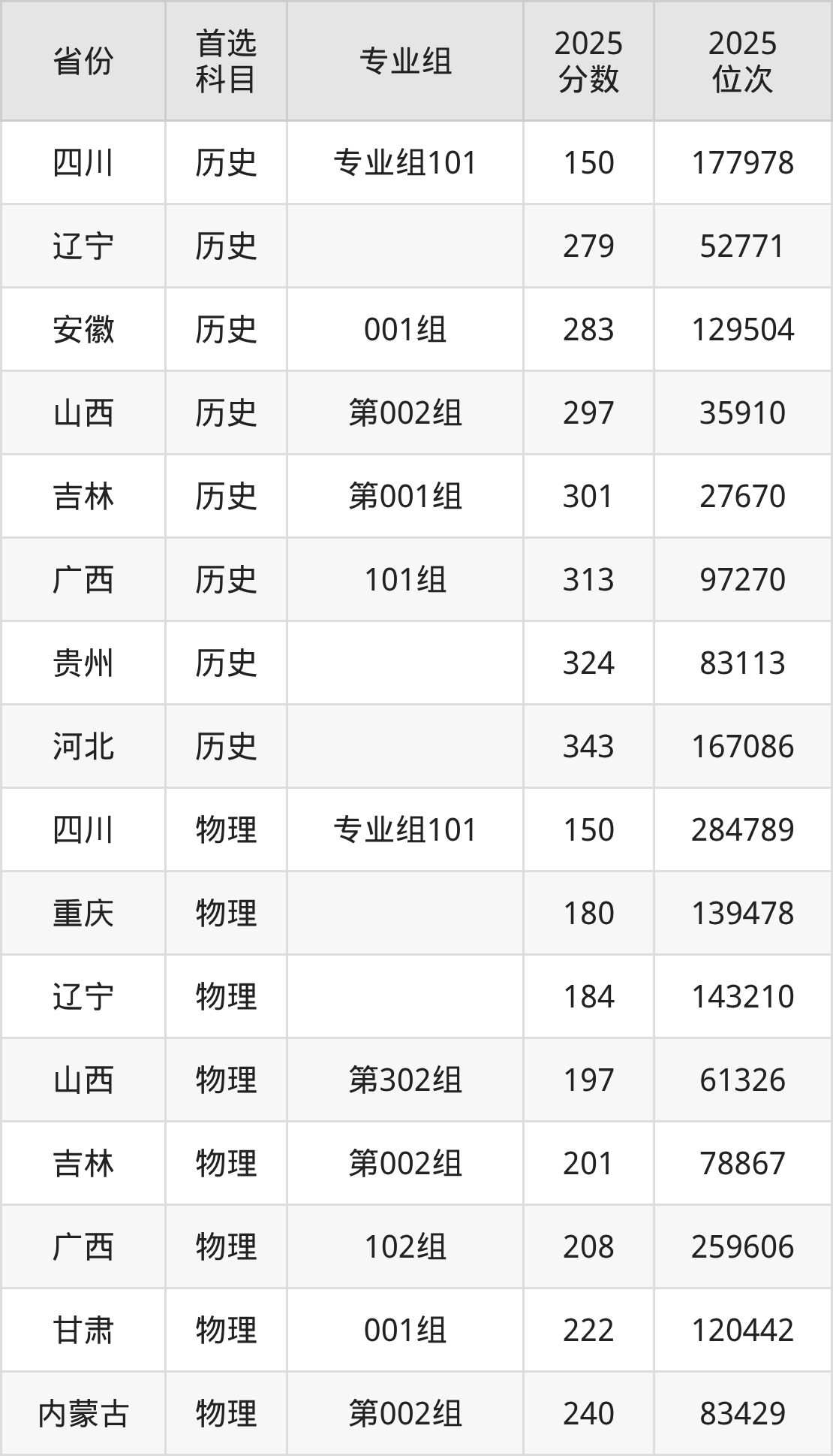 历史类最低分对应地区为四川(专业组101),录取位次为177978;最高分对应地区为河北,录取位次为167086,超专科线143分。