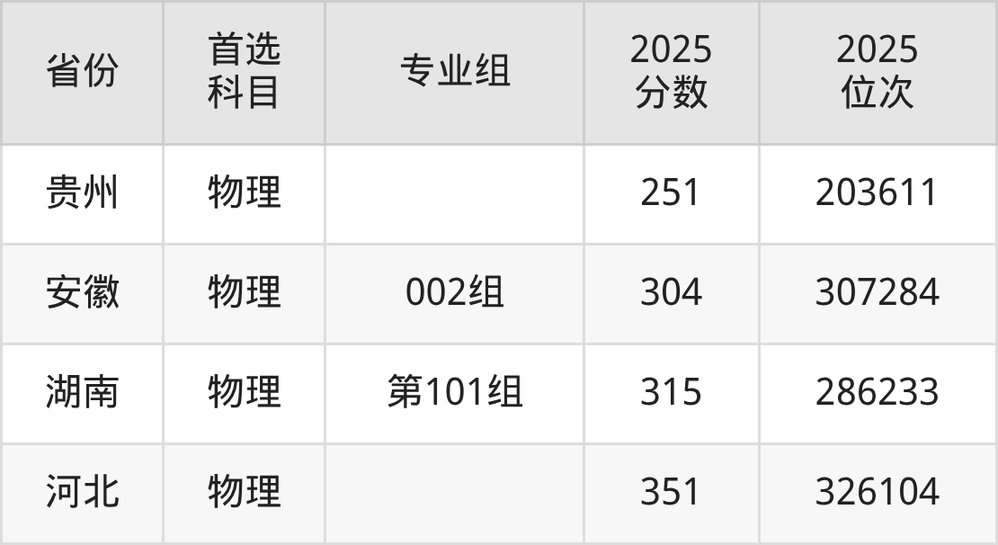 物理类最低分对应地区为四川(专业组101),录取位次为284789;最高分对应地区为河北,录取位次为326104,超专科线151分。