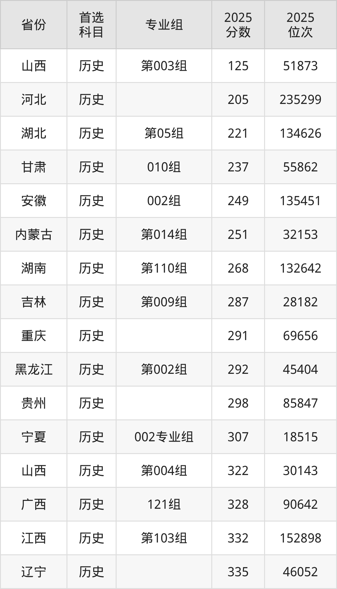 历史类最低分对应地区为山西(第003组),录取位次为51873,超专科线25分;最高分对应地区为广东(214组),录取位次为52509,超本科线43分。