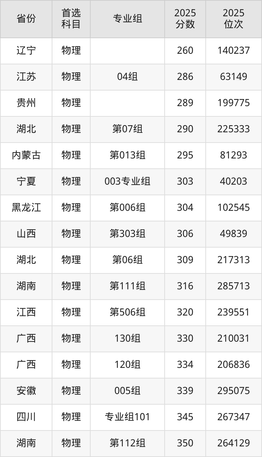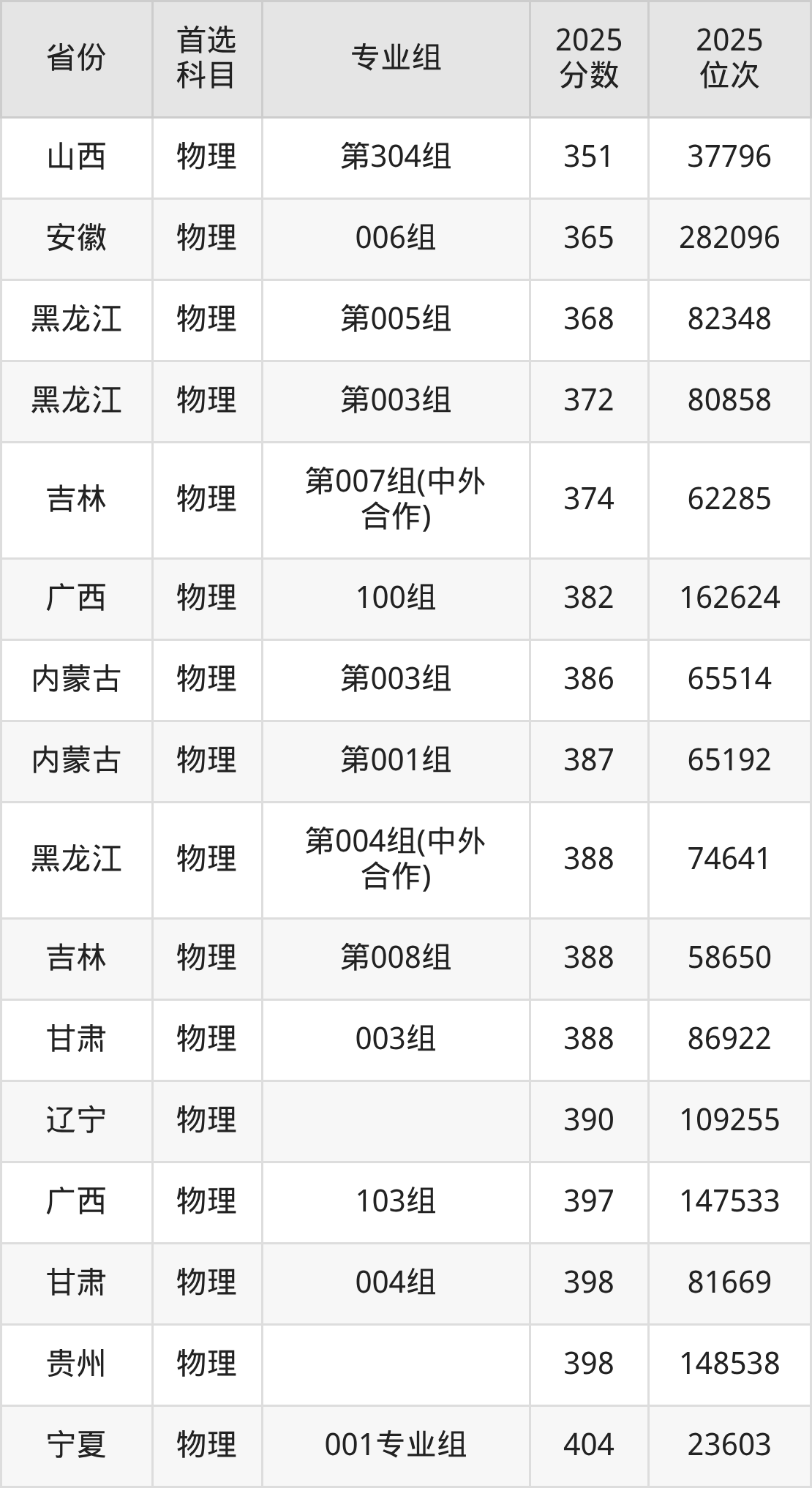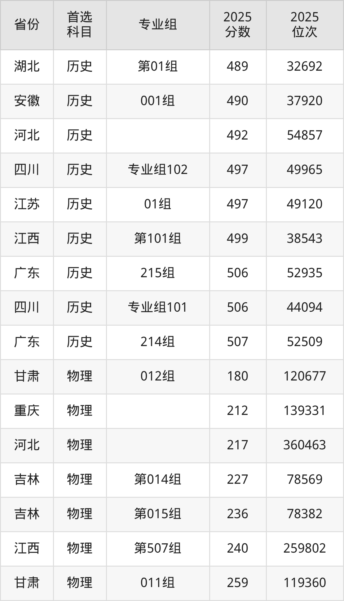物理类最低分对应地区为甘肃(012组),录取位次为120677;最高分对应地区为广东(218组),录取位次为176244,超本科线58分。