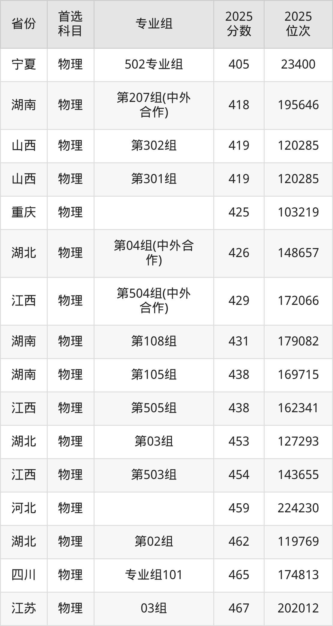 物理类:第502组463分、132319名,第503组457分、139290名,第504组(中外合作)447分、151003名,第505组291分、245380名;