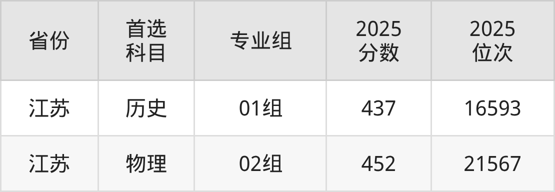历史类最低分对应地区为江苏(01组),录取位次为16593,超专科线217分。