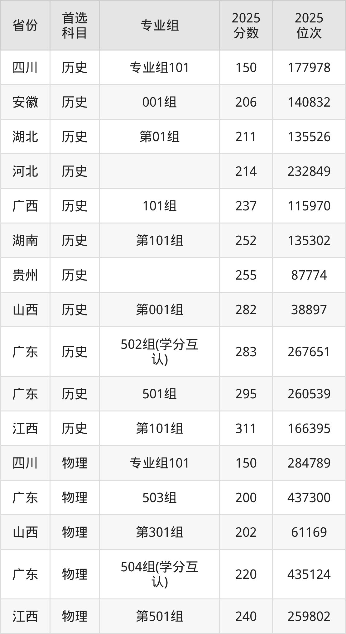 历史类最低分对应地区为四川(专业组101),录取位次为177978;最高分对应地区为江西(第101组),录取位次为166395,超专科线21分。