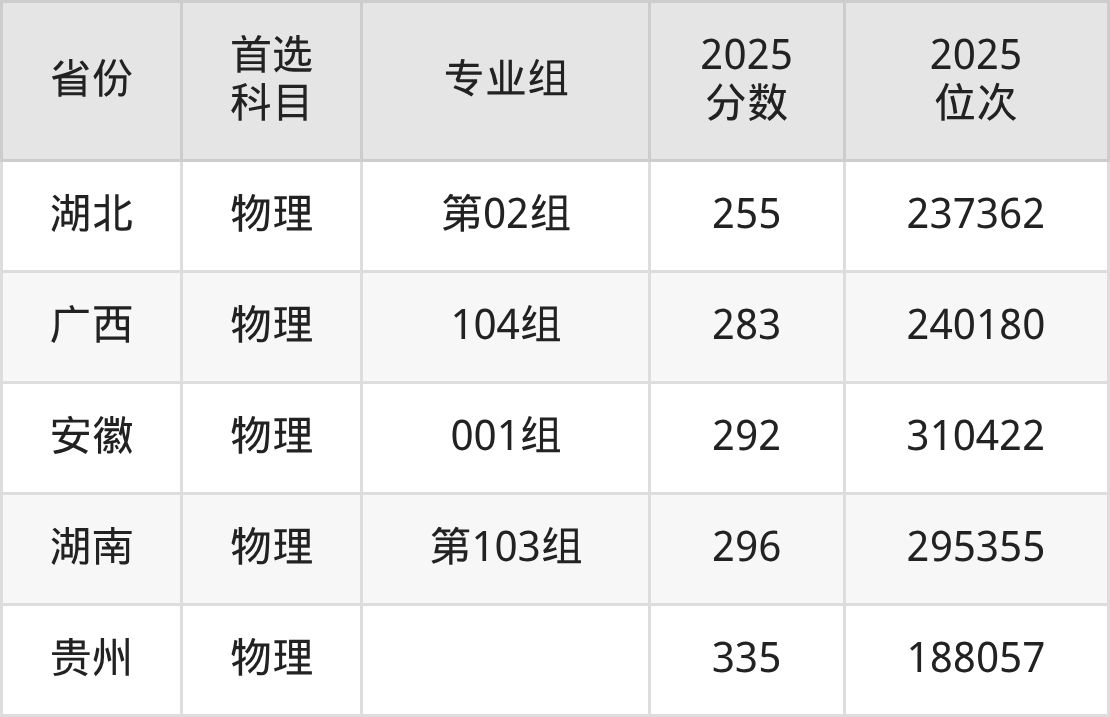 物理类最低分对应地区为四川(专业组101),录取位次为284789;最高分对应地区为贵州,录取位次为188057,超专科线155分。