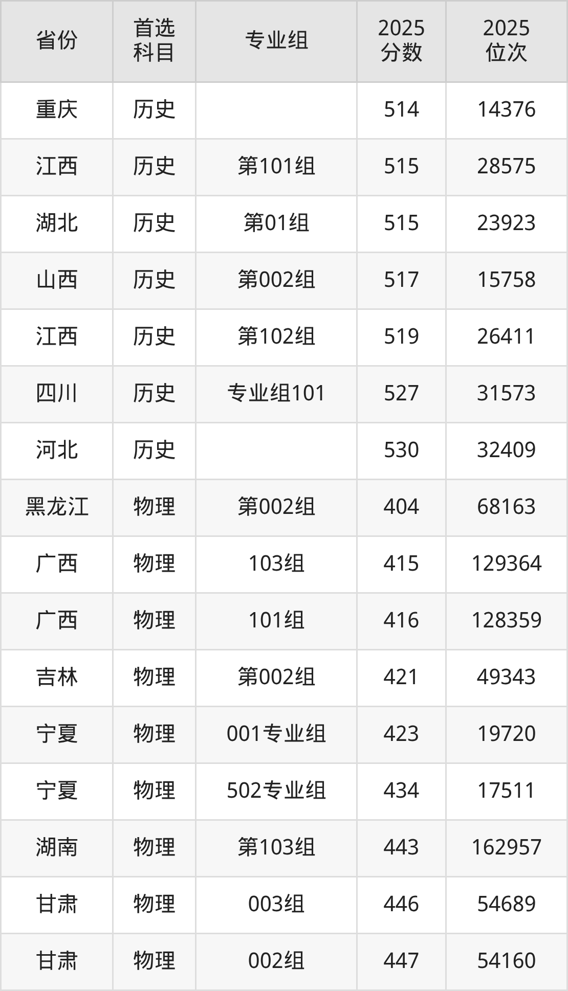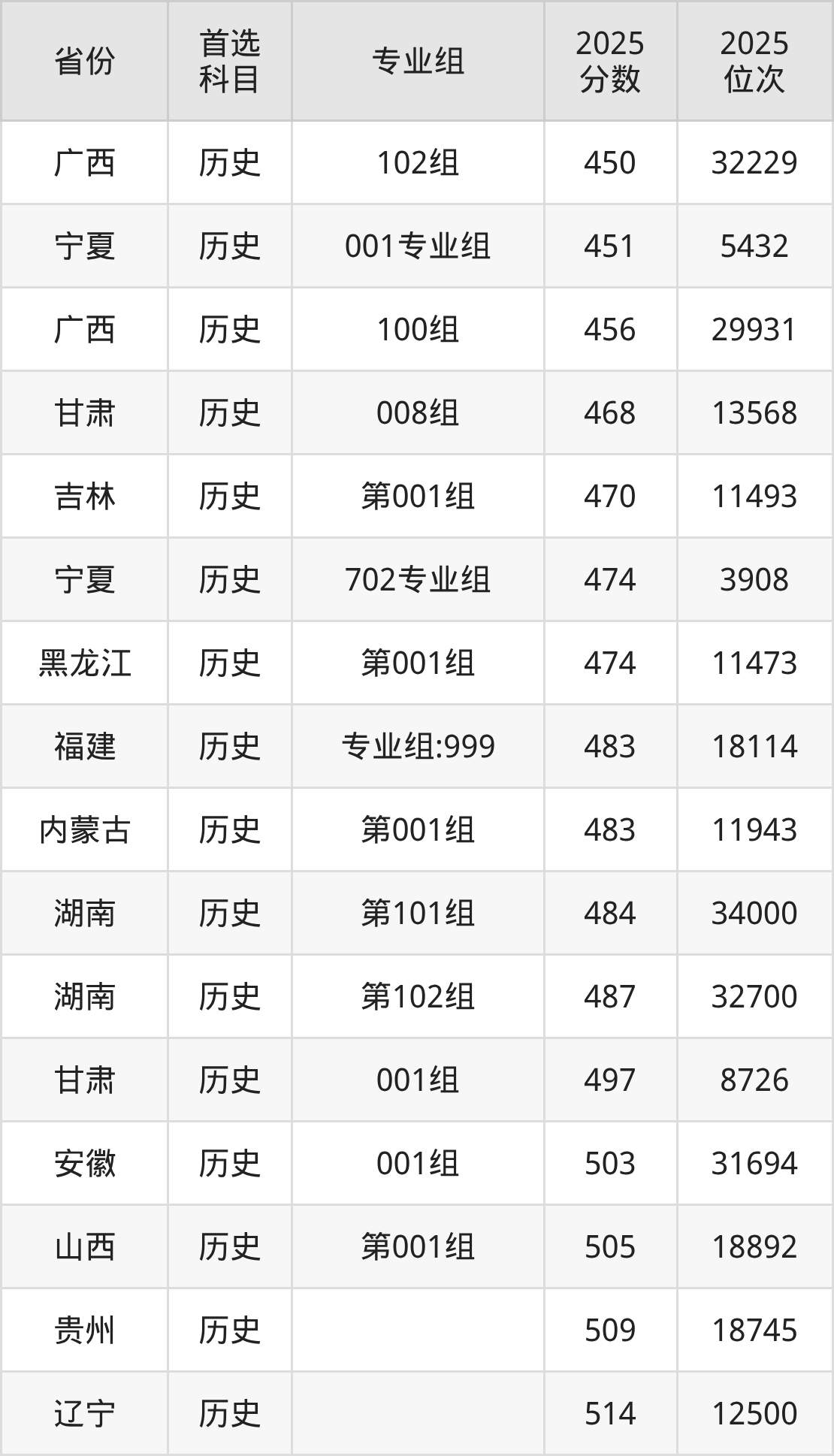 历史类最低分对应地区为广西(102组),录取位次为32229,超本科线48分;最高分对应地区为河北,录取位次为32409,超本科线53分。