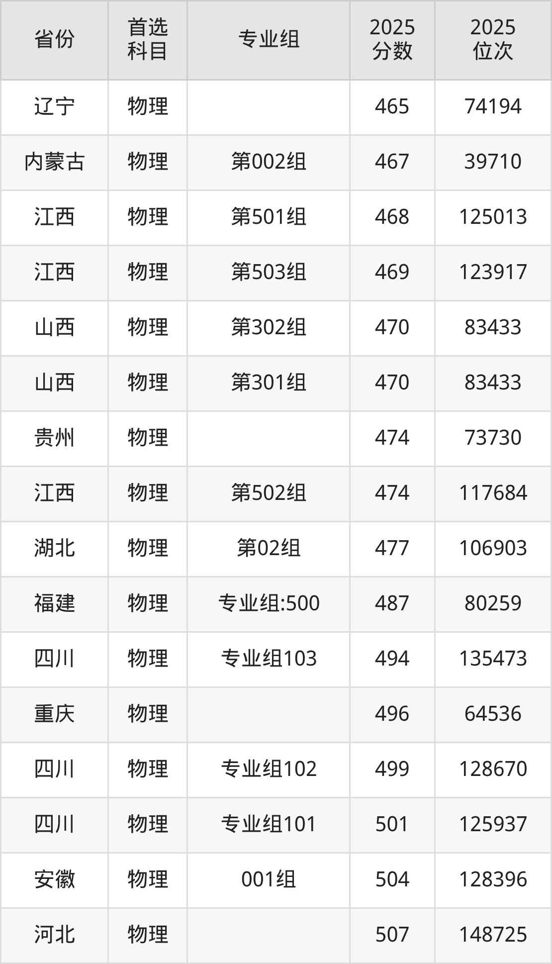 物理类最低分对应地区为黑龙江(第002组),录取位次为68163,超本科线44分;最高分对应地区为河北,录取位次为148725,超本科线48分。