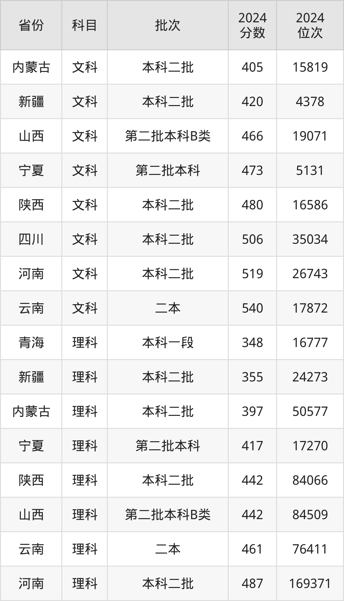 文科最低分对应地区为内蒙古,录取位次为15819,超24分;最高分对应地区为云南,录取位次为17872,超二本线60分。