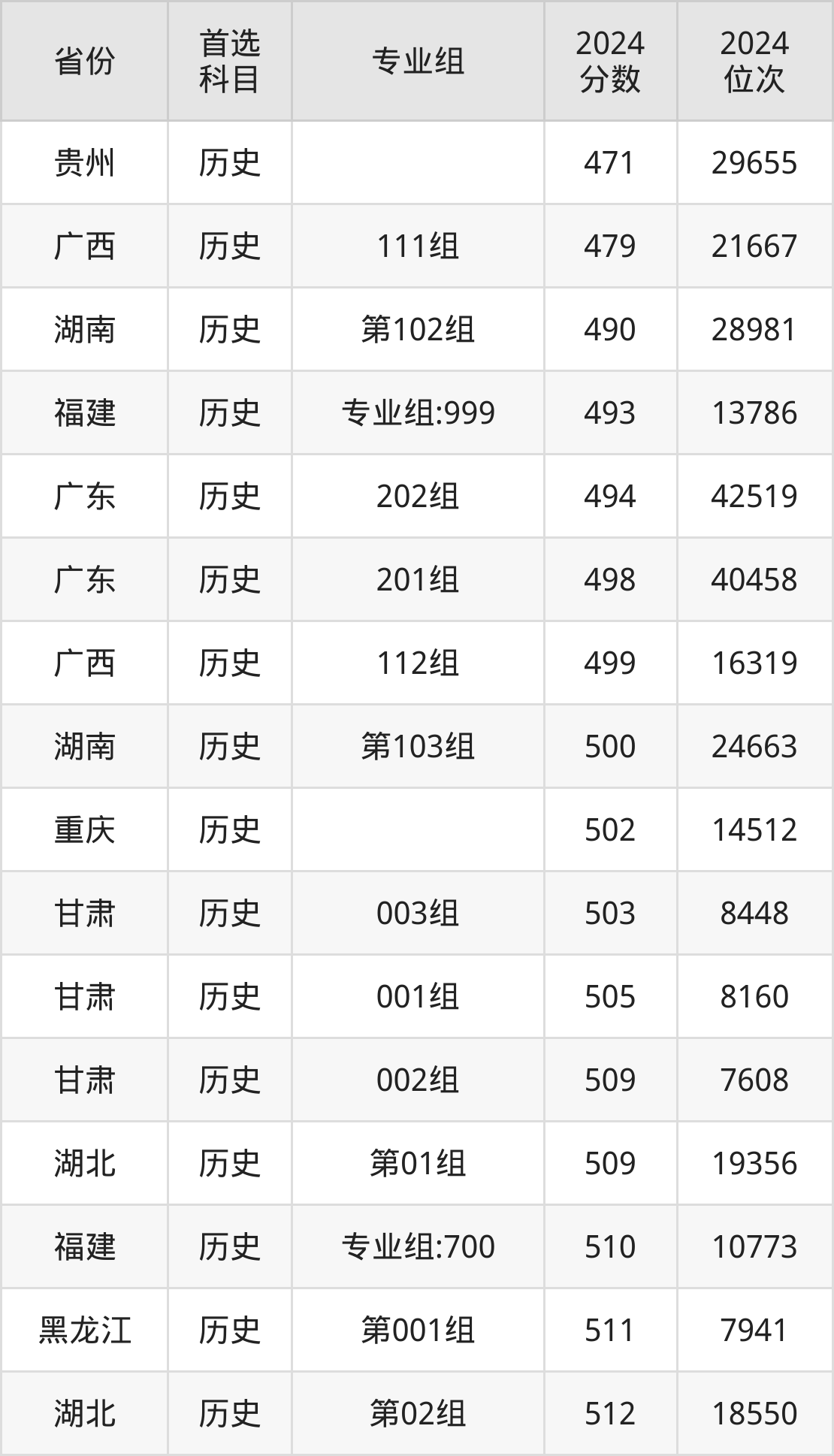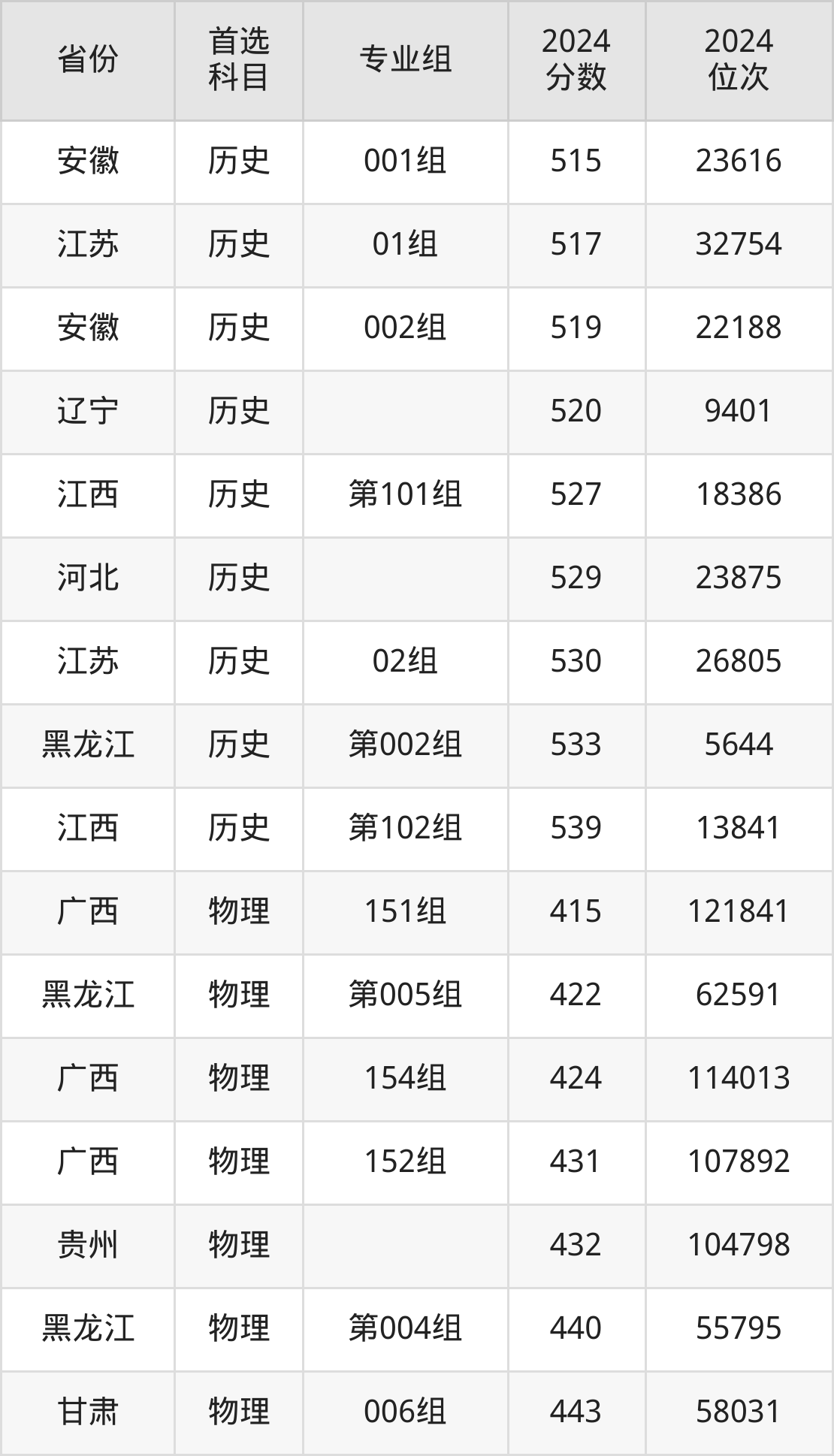 历史类最低分对应地区为贵州,录取位次为29655,超本科线29分;最高分对应地区为江西(第102组),录取位次为13841,超本科线76分。