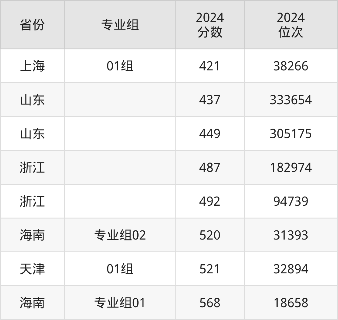 最低分对应地区为上海(01组),录取位次为38266,超本科线18分;最高分对应地区为海南(专业组01),录取位次为18658,超本科线85分。