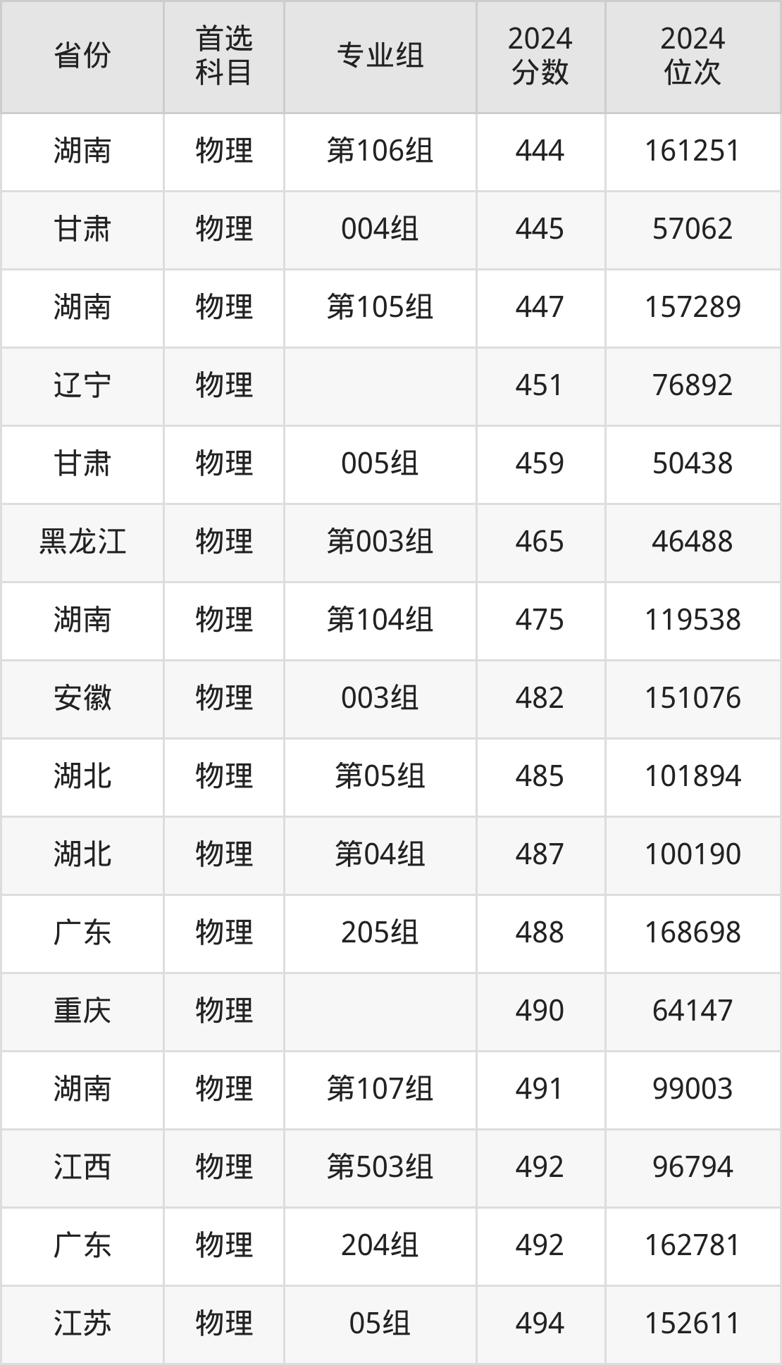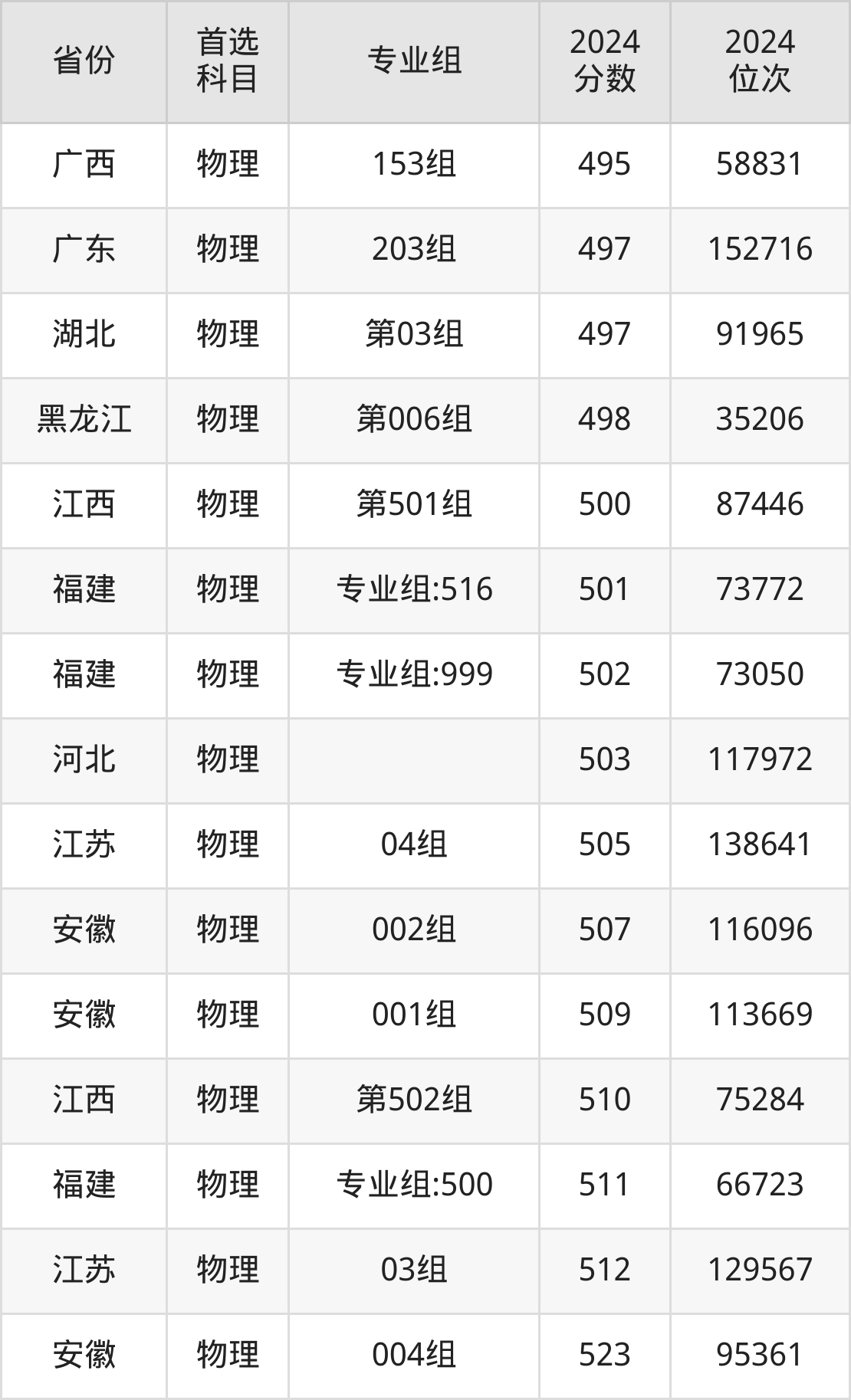 物理类最低分对应地区为广西(151组),录取位次为121841,超本科线44分;最高分对应地区为安徽(004组),录取位次为95361,超本科线58分。