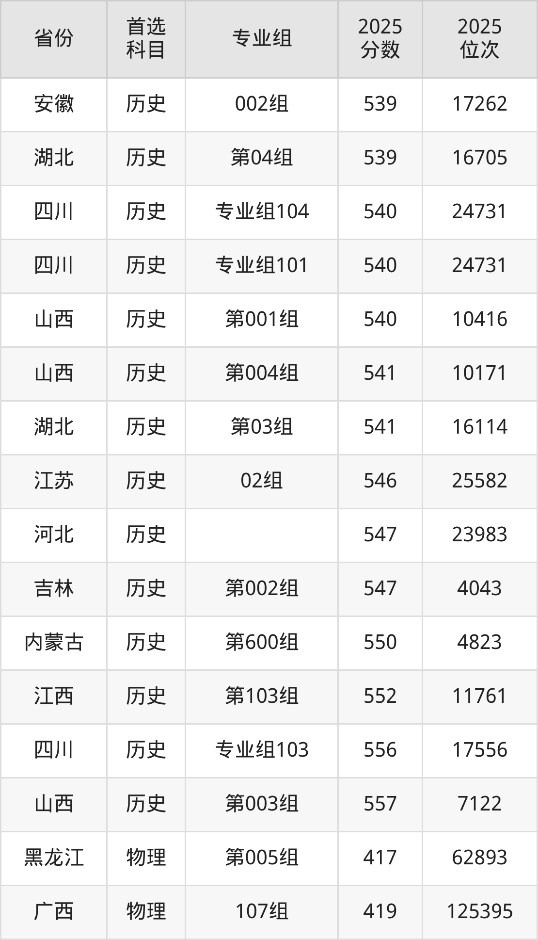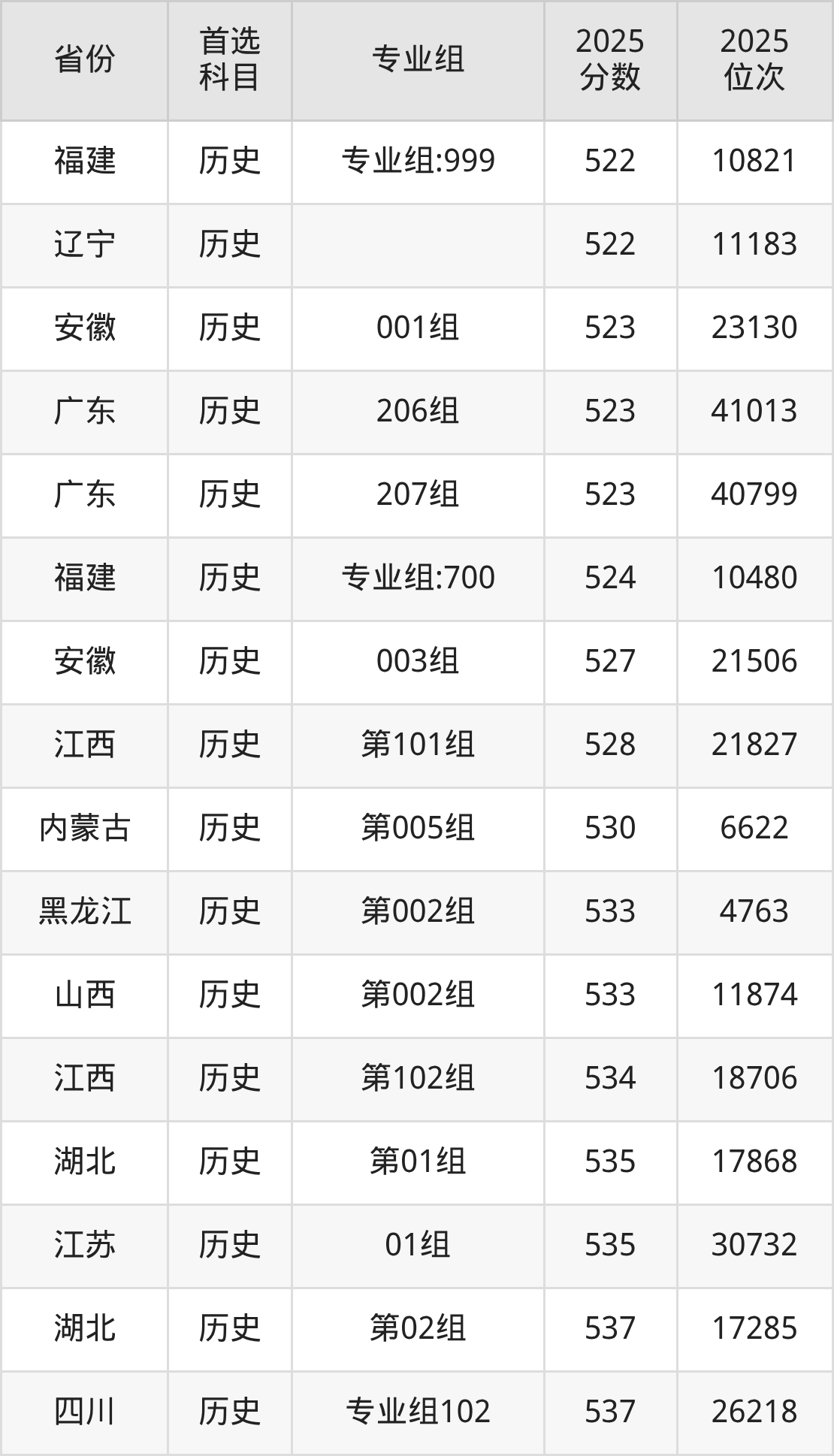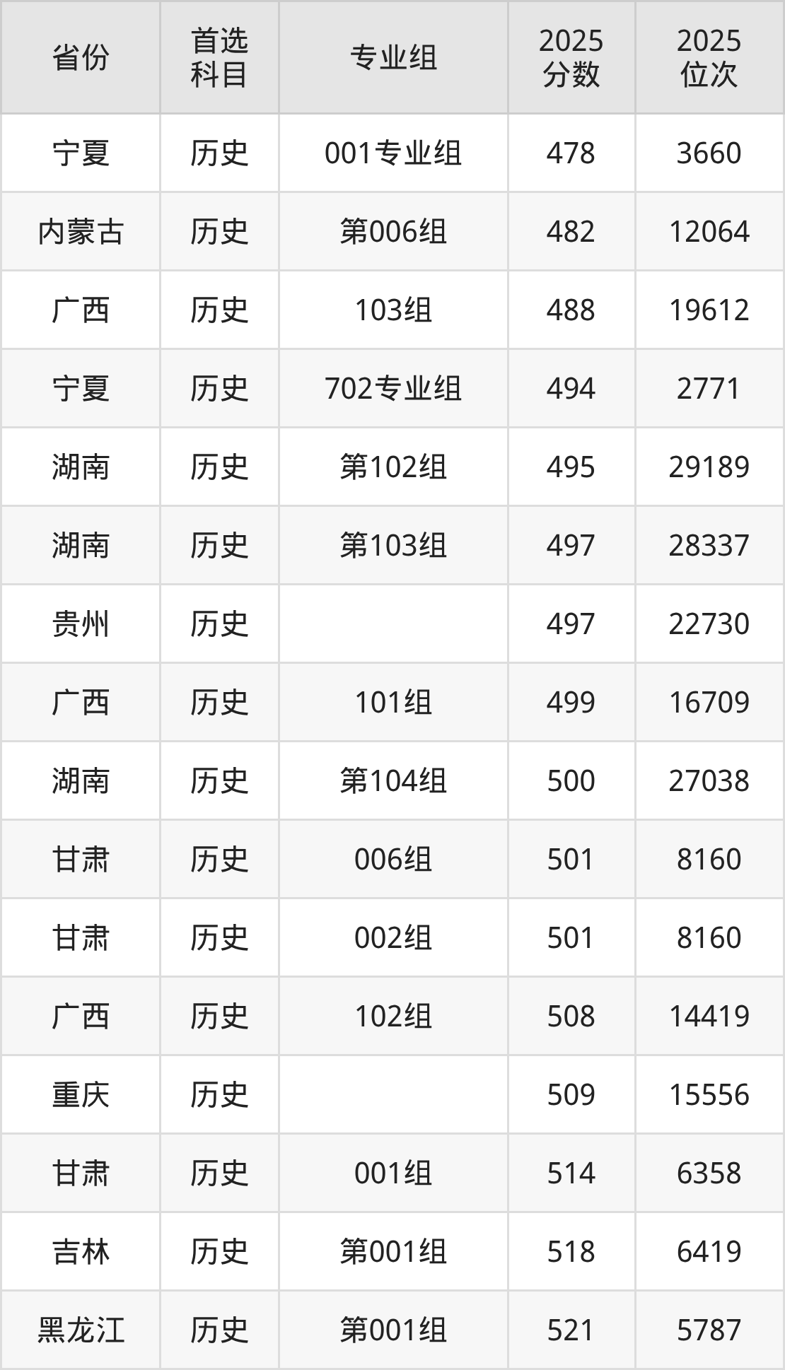 历史类最低分对应地区为宁夏(001专业组),录取位次为3660,超本科B74分;最高分对应地区为山西(第003组),录取位次为7122,超本科线114分。