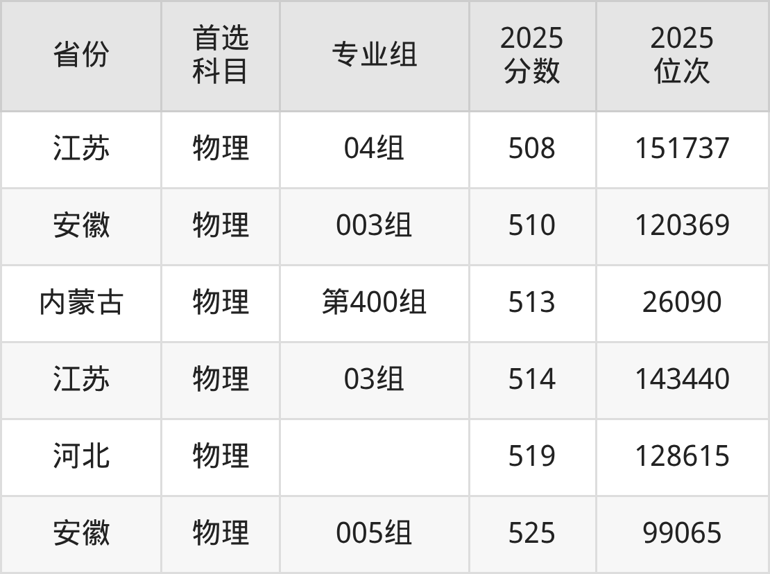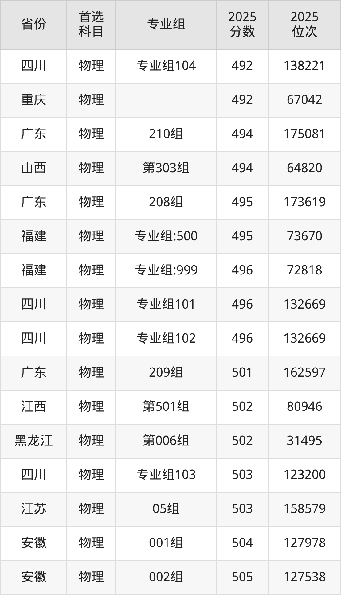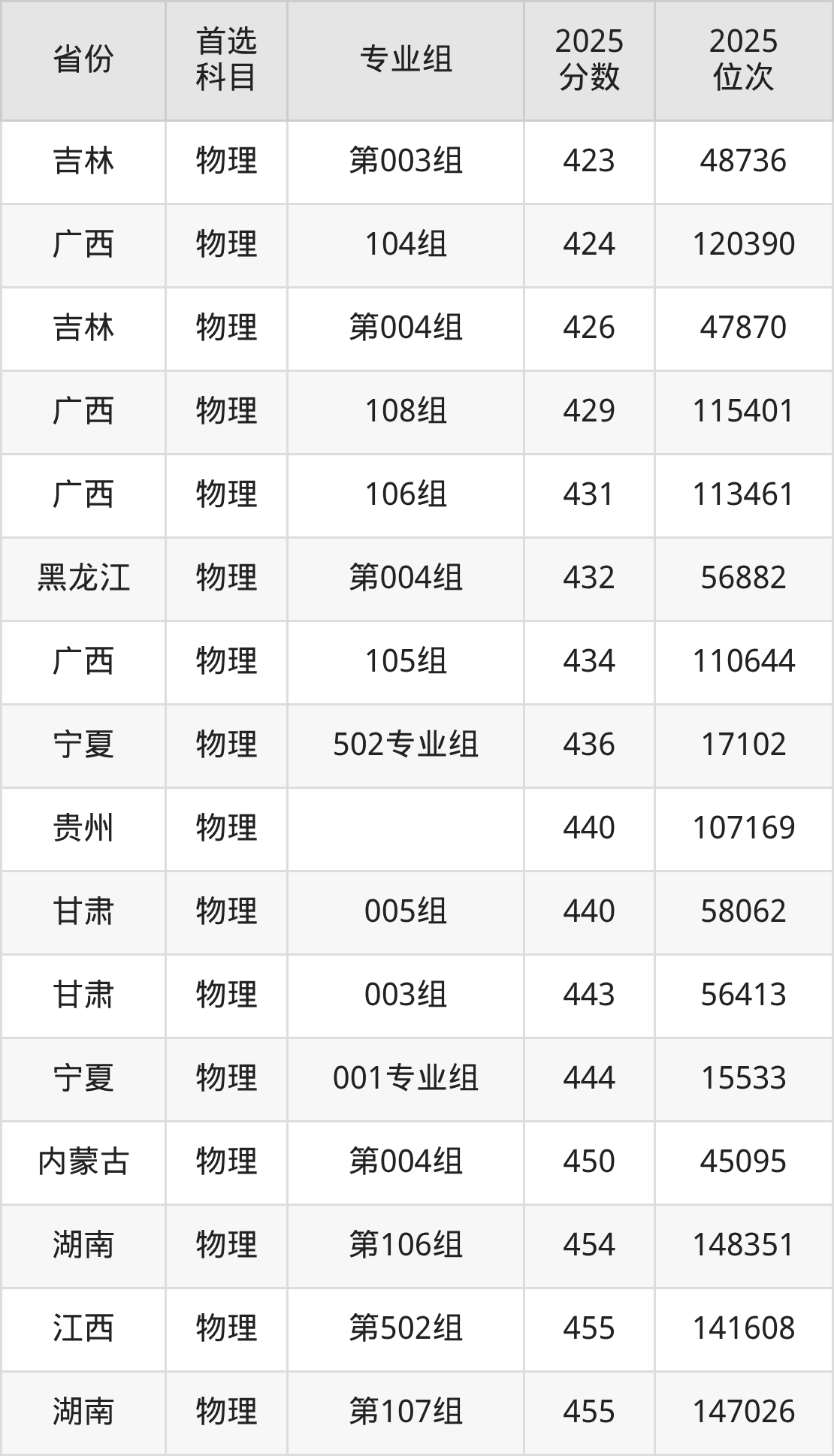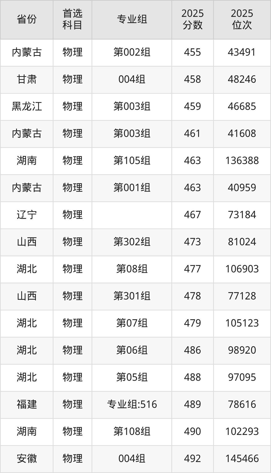 物理类最低分对应地区为黑龙江(第005组),录取位次为62893,超本科线57分;最高分对应地区为安徽(005组),录取位次为99065,超本科线64分。
