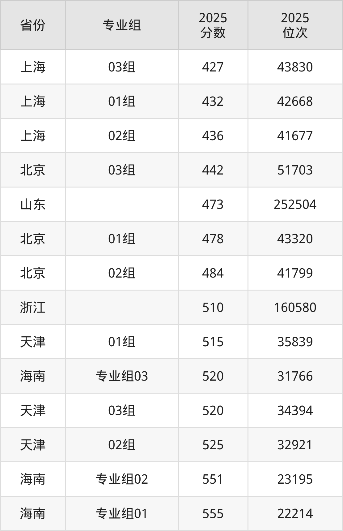 最低分对应地区为上海(03组),录取位次为43830,超本科线25分;最高分对应地区为海南(专业组01),录取位次为22214,超本科线75分。