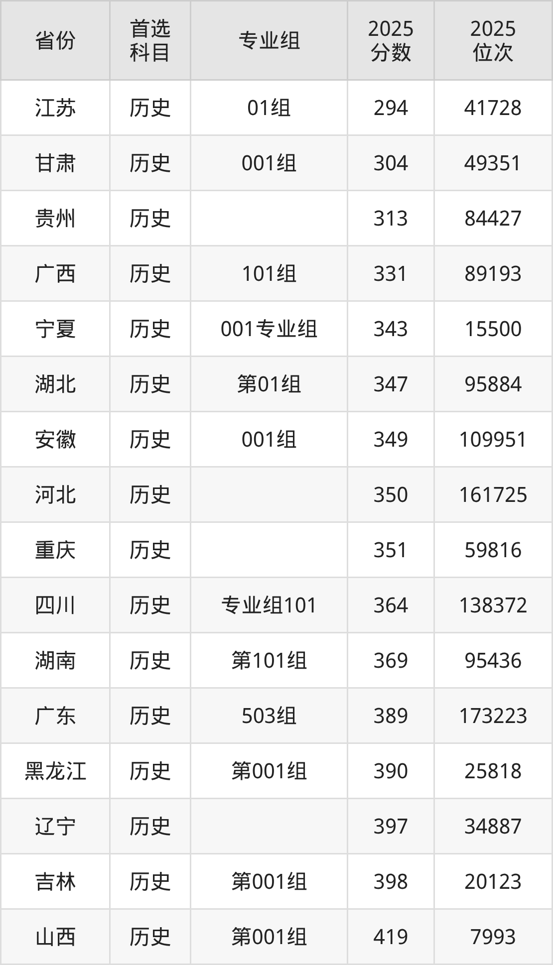 历史类最低分对应地区为江苏(01组),录取位次为41728,超专科线74分;最高分对应地区为江西(第101组),录取位次为81913,超专科线143分。