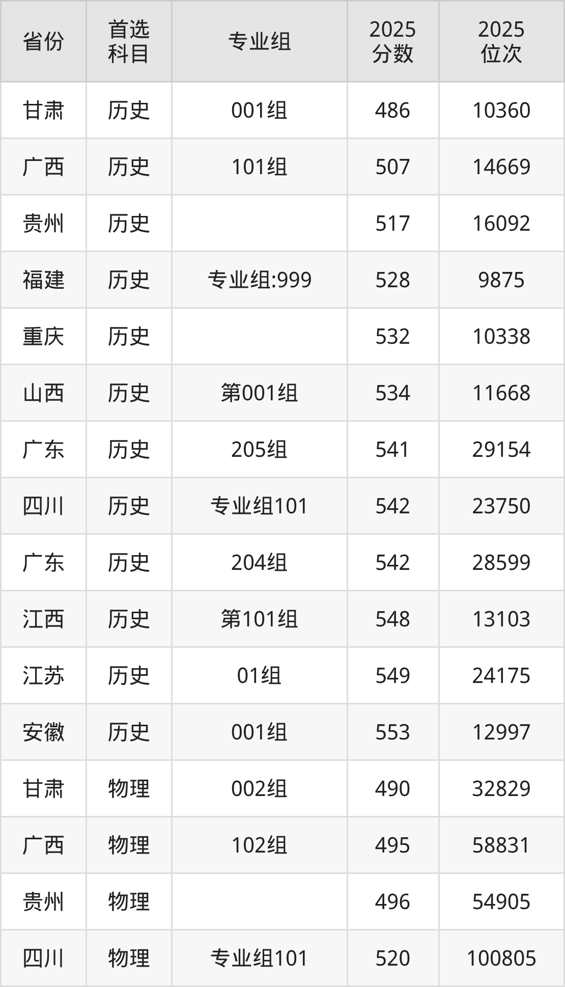 历史类最低分对应地区为甘肃(001组),录取位次为10360,超本科线74分;最高分对应地区为安徽(001组),录取位次为12997,超本科线76分。