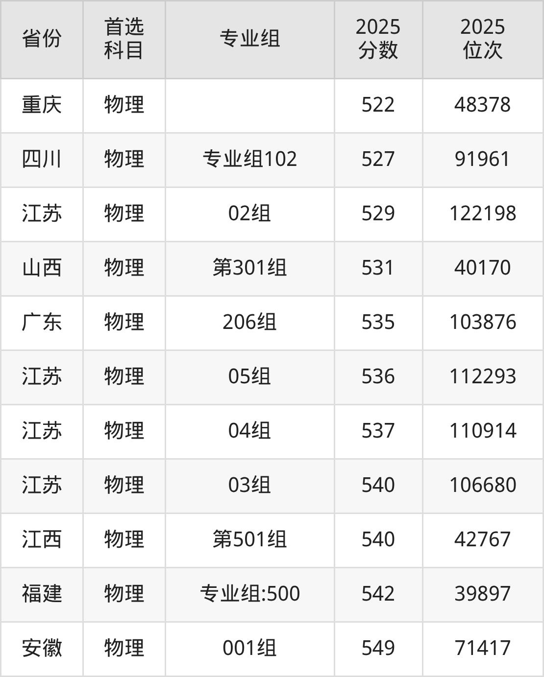 物理类:02组529分、122198名,03组540分、106680名,04组537分、110914名,05组536分、112293名;