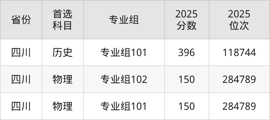 物理类最低分对应地区为四川(专业组102),录取位次为284789;最高分对应地区为四川(专业组101),录取位次为284789。