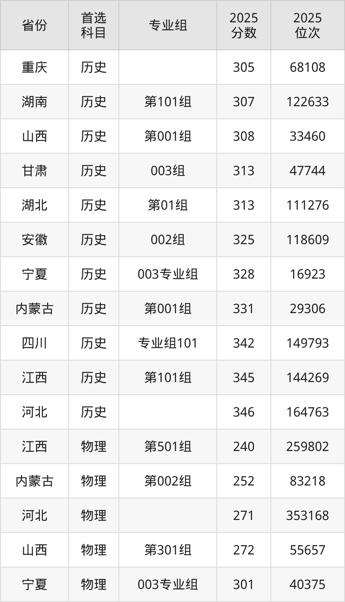 历史类最低分对应地区为重庆,录取位次为68108,超专科线125分;最高分对应地区为河北,录取位次为164763,超专科线146分。