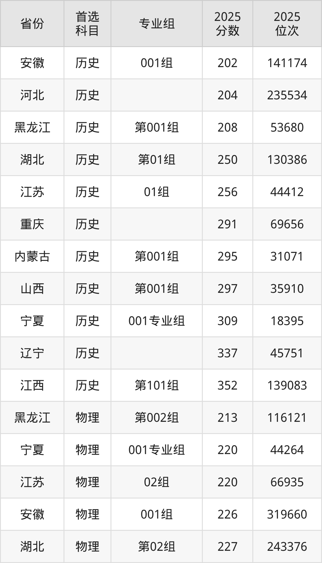 历史类最低分对应地区为安徽(001组),录取位次为141174,超专科线2分;最高分对应地区为江西(第101组),录取位次为139083,超专科线62分。