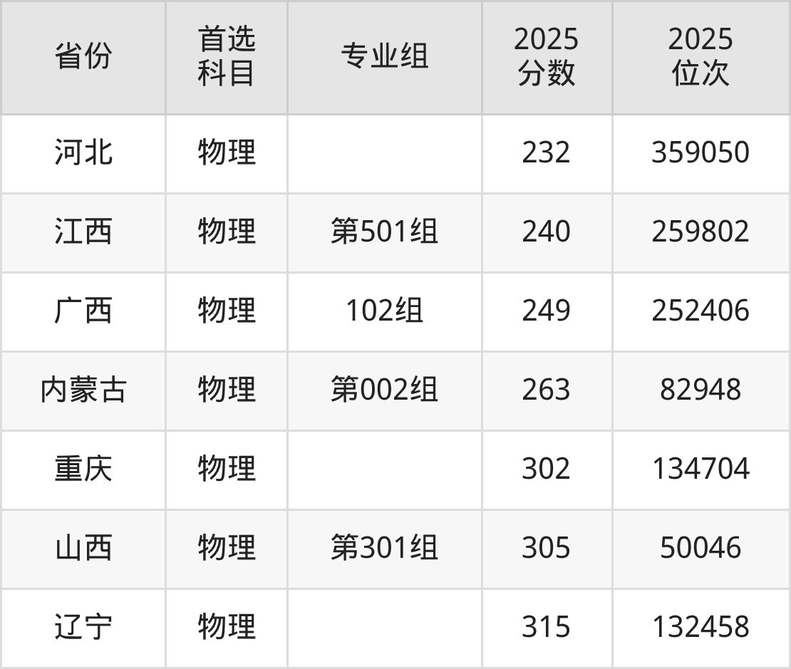 物理类最低分对应地区为黑龙江(第002组),录取位次为116121,超专科线53分;最高分对应地区为辽宁,录取位次为132458,超专科线165分。