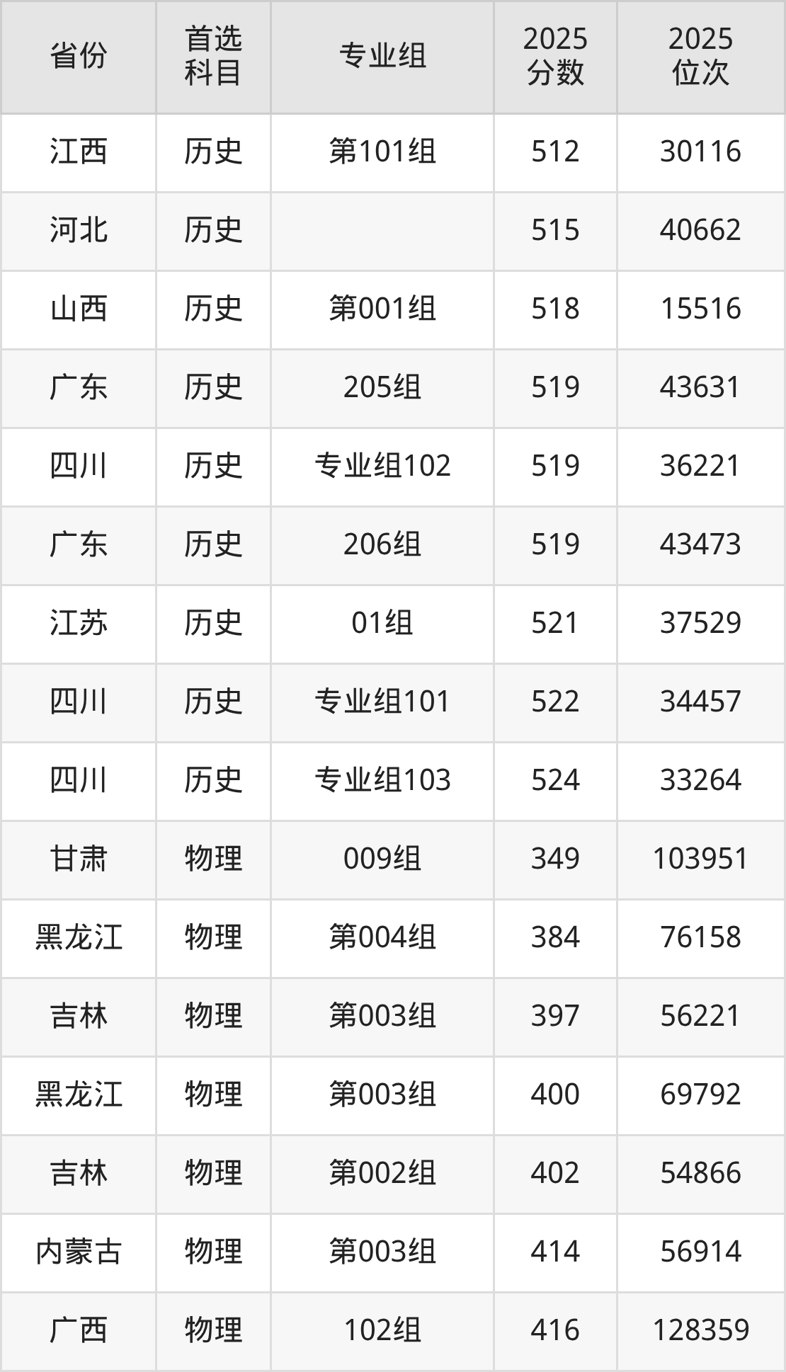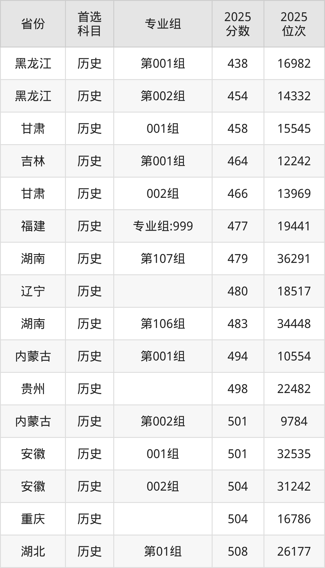 历史类最低分对应地区为黑龙江(第001组),录取位次为16982,超本科线33分;最高分对应地区为四川(专业组103),录取位次为33264,超本科B57分。