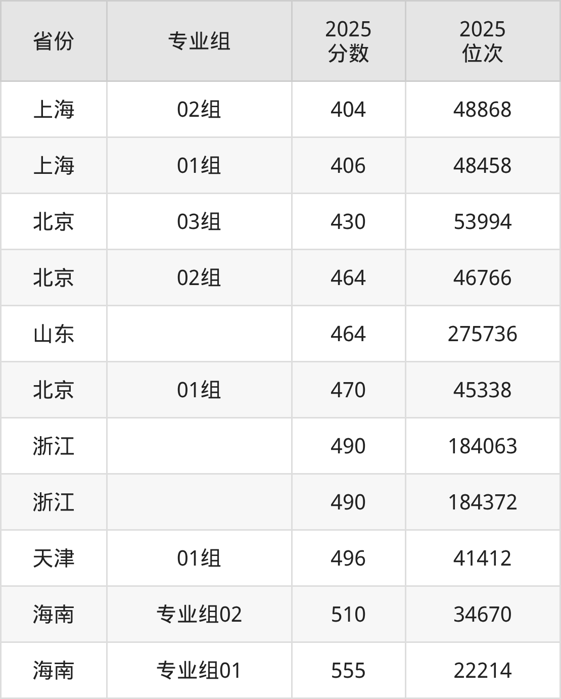 最低分对应地区为上海(02组),录取位次为48868,超本科线2分;最高分对应地区为海南(专业组01),录取位次为22214,超本科线75分。