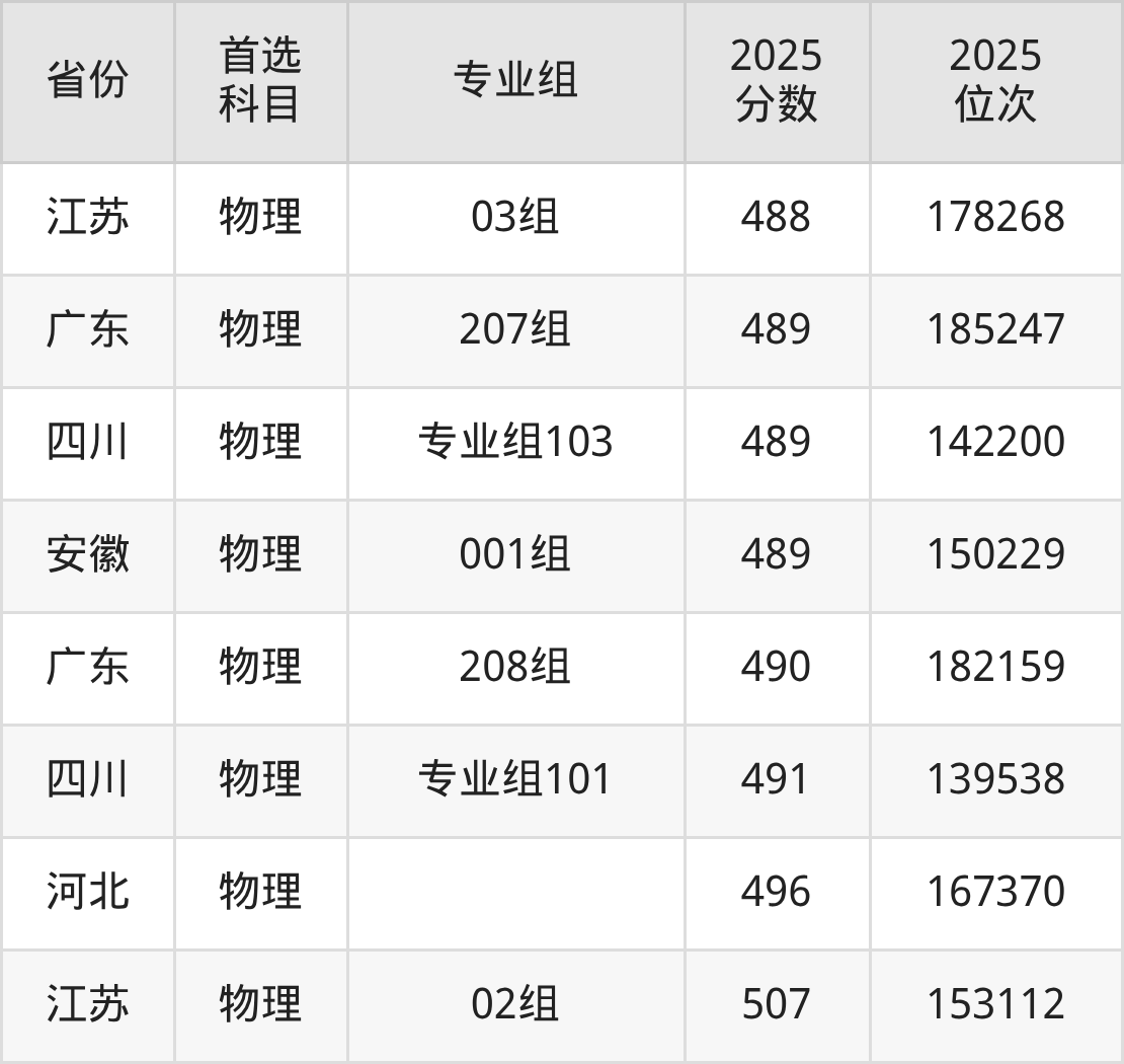 物理类最低分对应地区为甘肃(009组),录取位次为103951,超专科线169分;最高分对应地区为江苏(02组),录取位次为153112,超本科线44分。