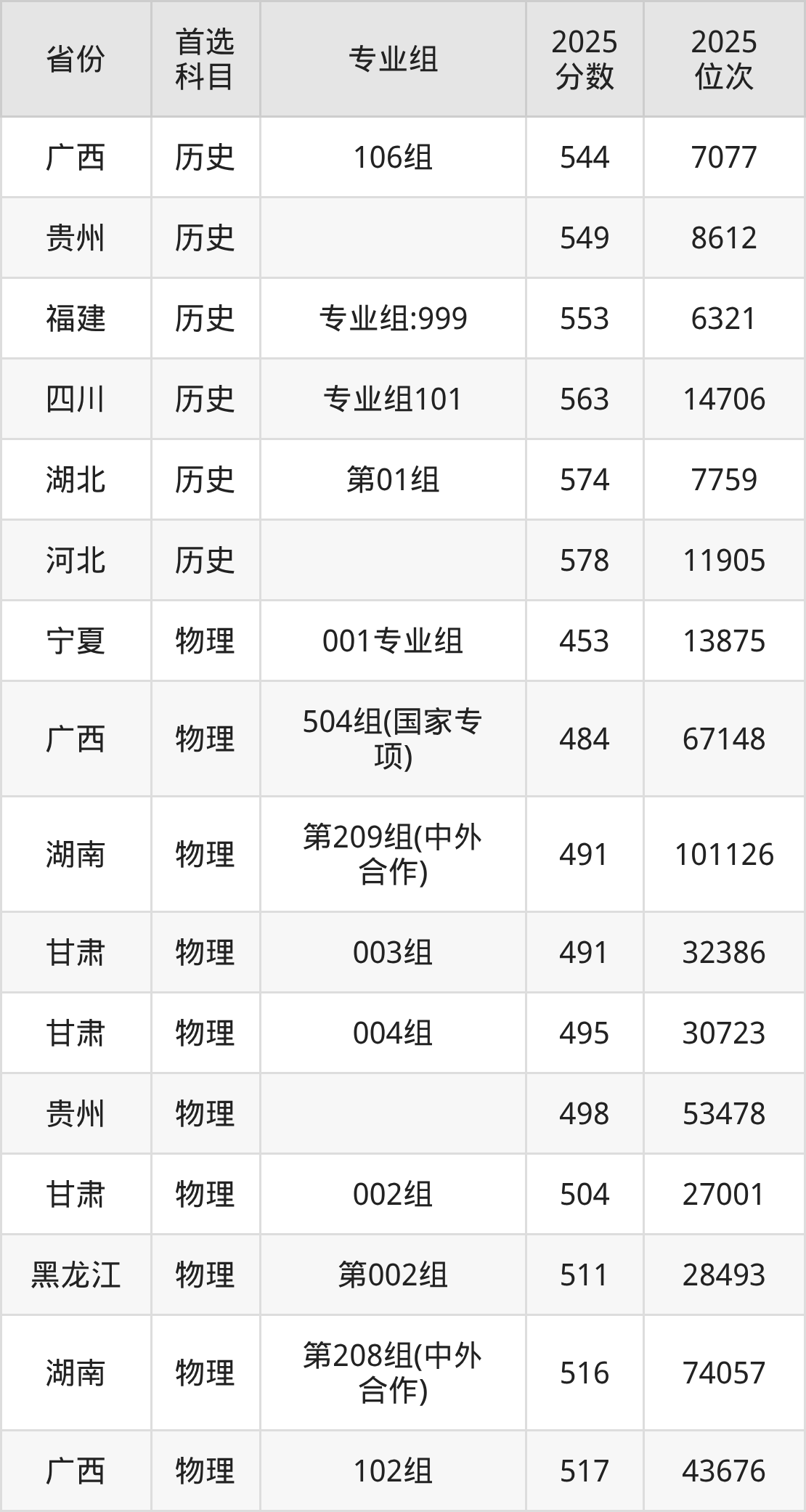 历史类最低分对应地区为广西(106组),录取位次为7077,超本科线142分;最高分对应地区为河北,录取位次为11905,超本科线101分。
