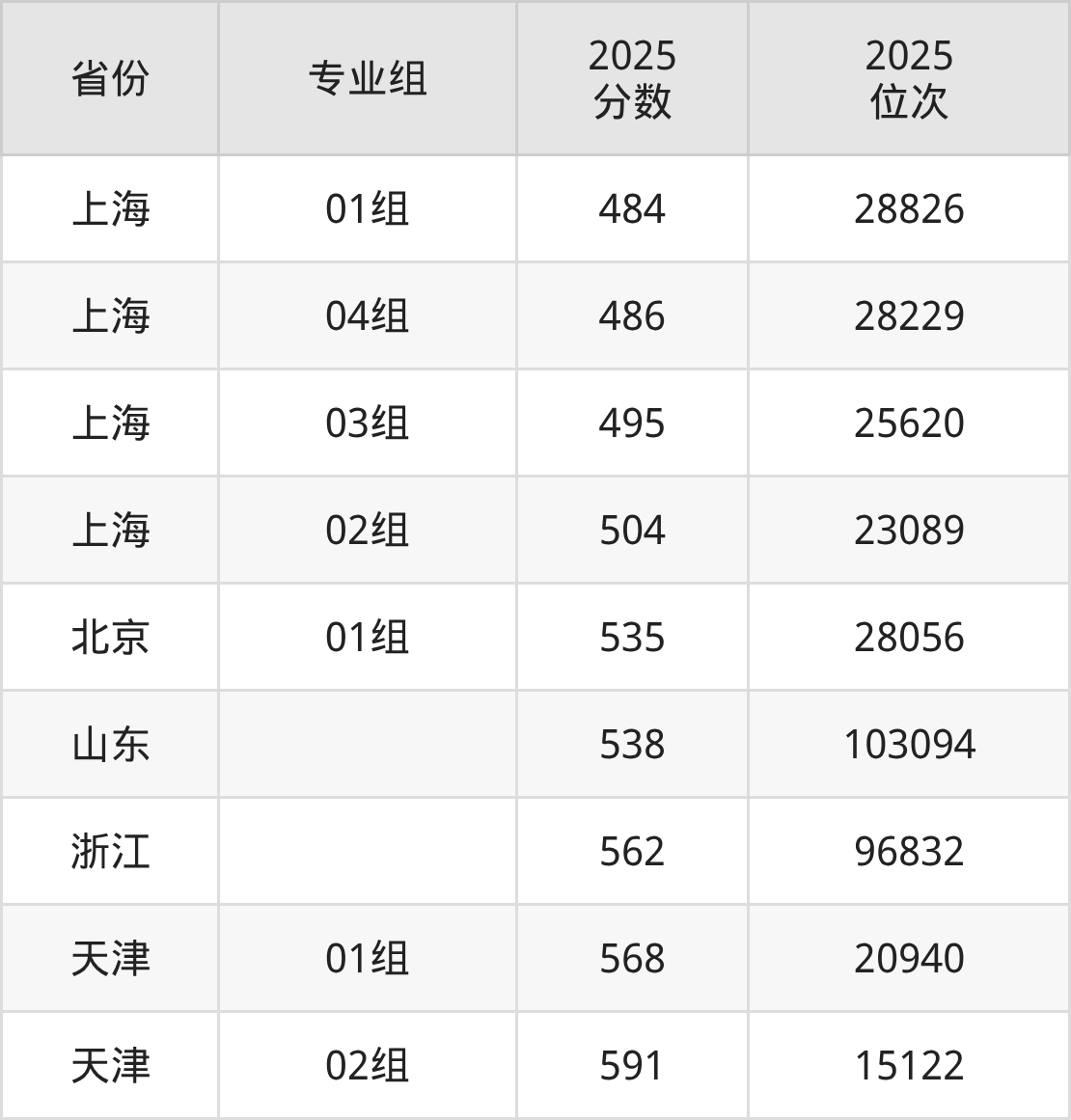 最低分对应地区为上海(01组),录取位次为28826,超本科线82分;最高分对应地区为天津(02组),录取位次为15122,超本科线115分。