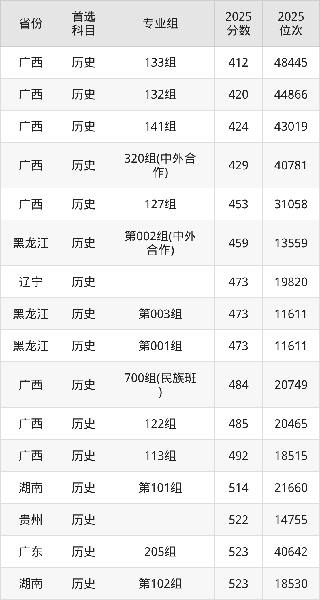 历史类最低分对应地区为广西(133组),录取位次为48445,超专科线212分;最高分对应地区为四川(专业组102),录取位次为21412。