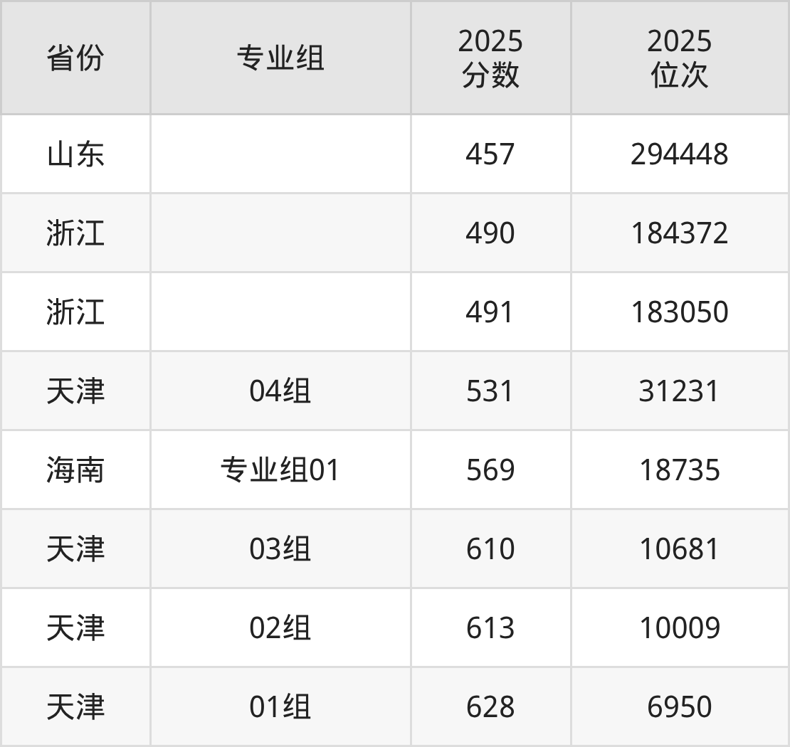 最低分对应地区为山东,录取位次为294448,超一段线66分;最高分对应地区为天津(01组),录取位次为6950,超本科线152分。