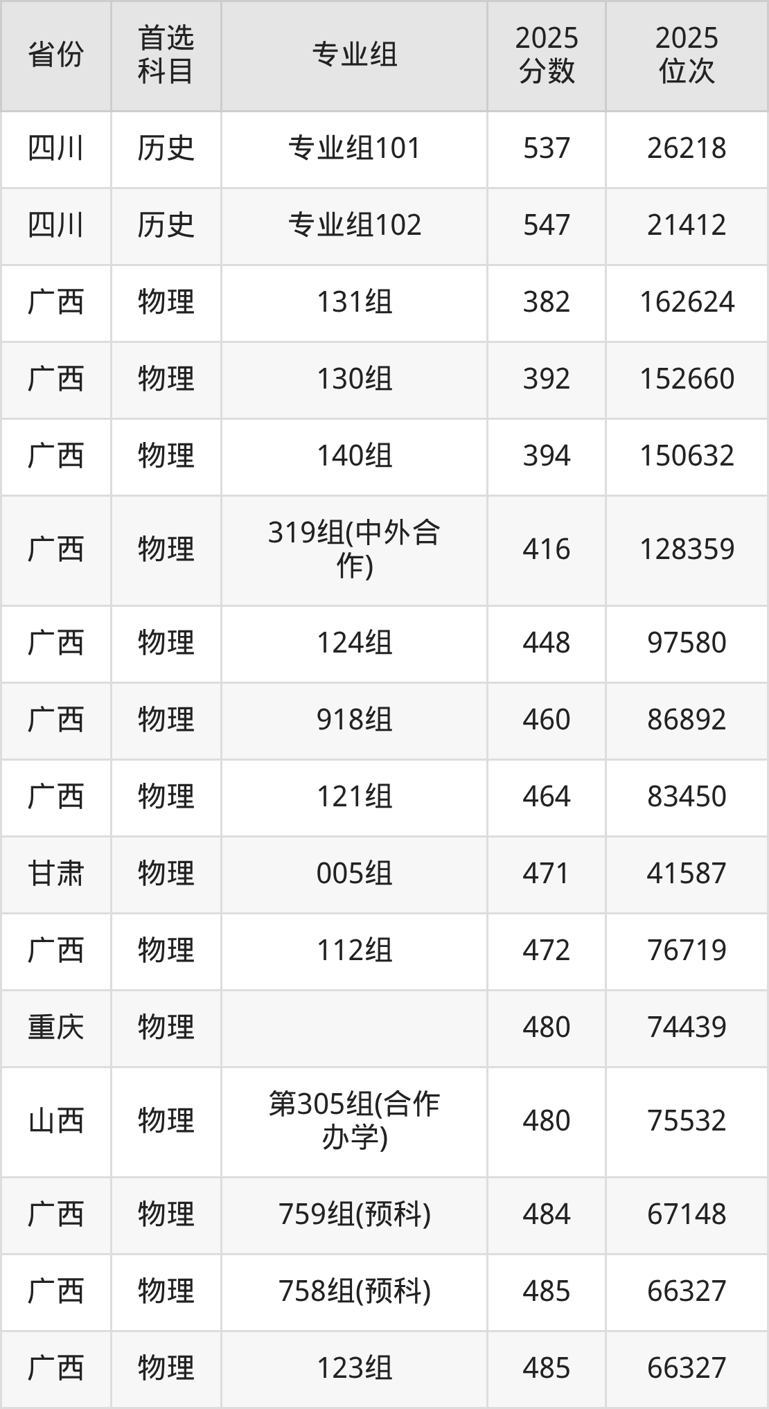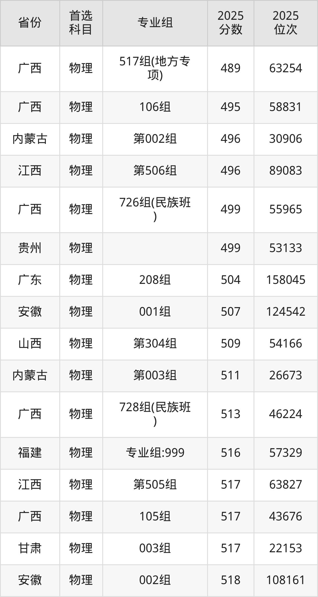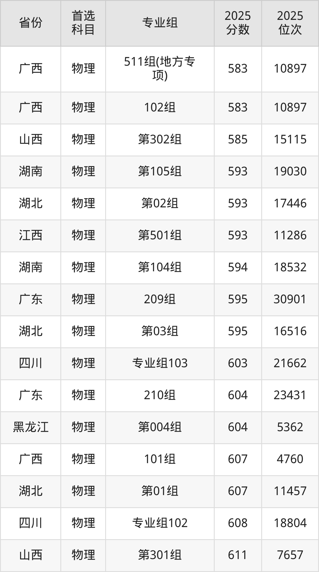 物理类最低分对应地区为广西(131组),录取位次为162624,超专科线182分;最高分对应地区为四川(专业组101),录取位次为9704。