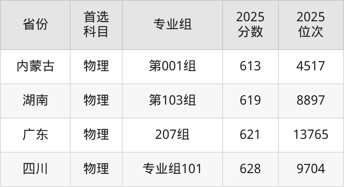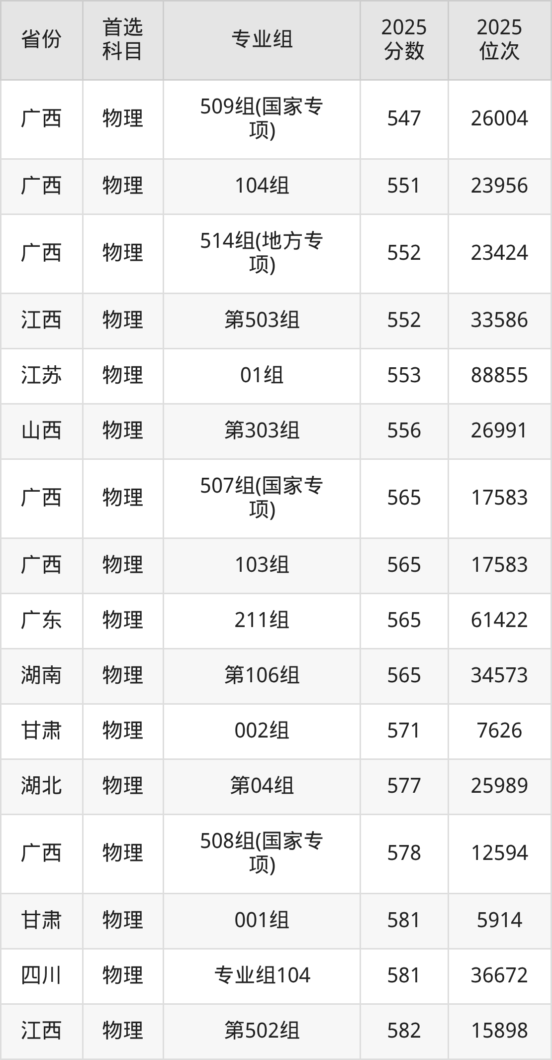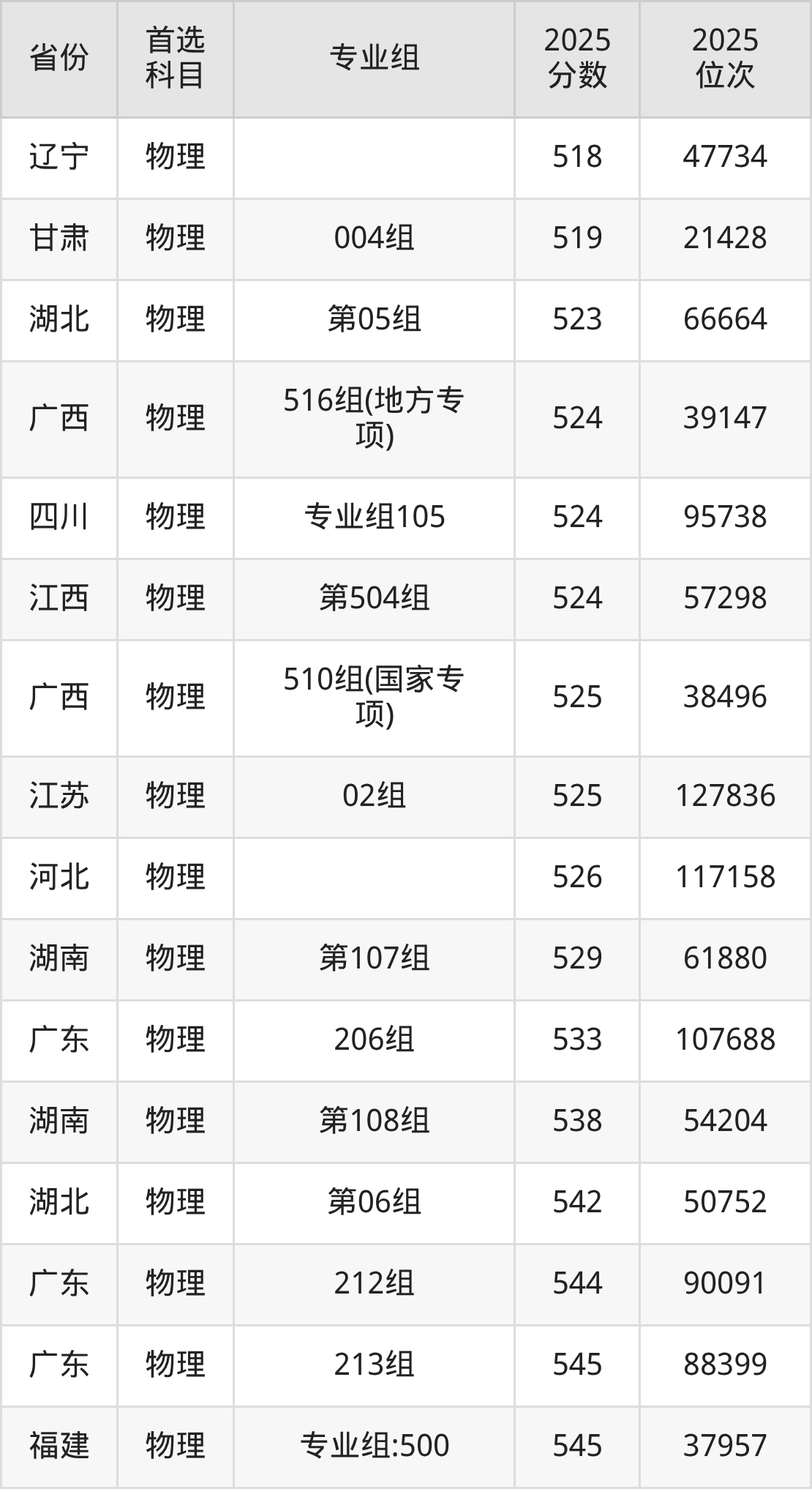 物理类最低分对应地区为广西(131组),录取位次为162624,超专科线182分;最高分对应地区为四川(专业组101),录取位次为9704。