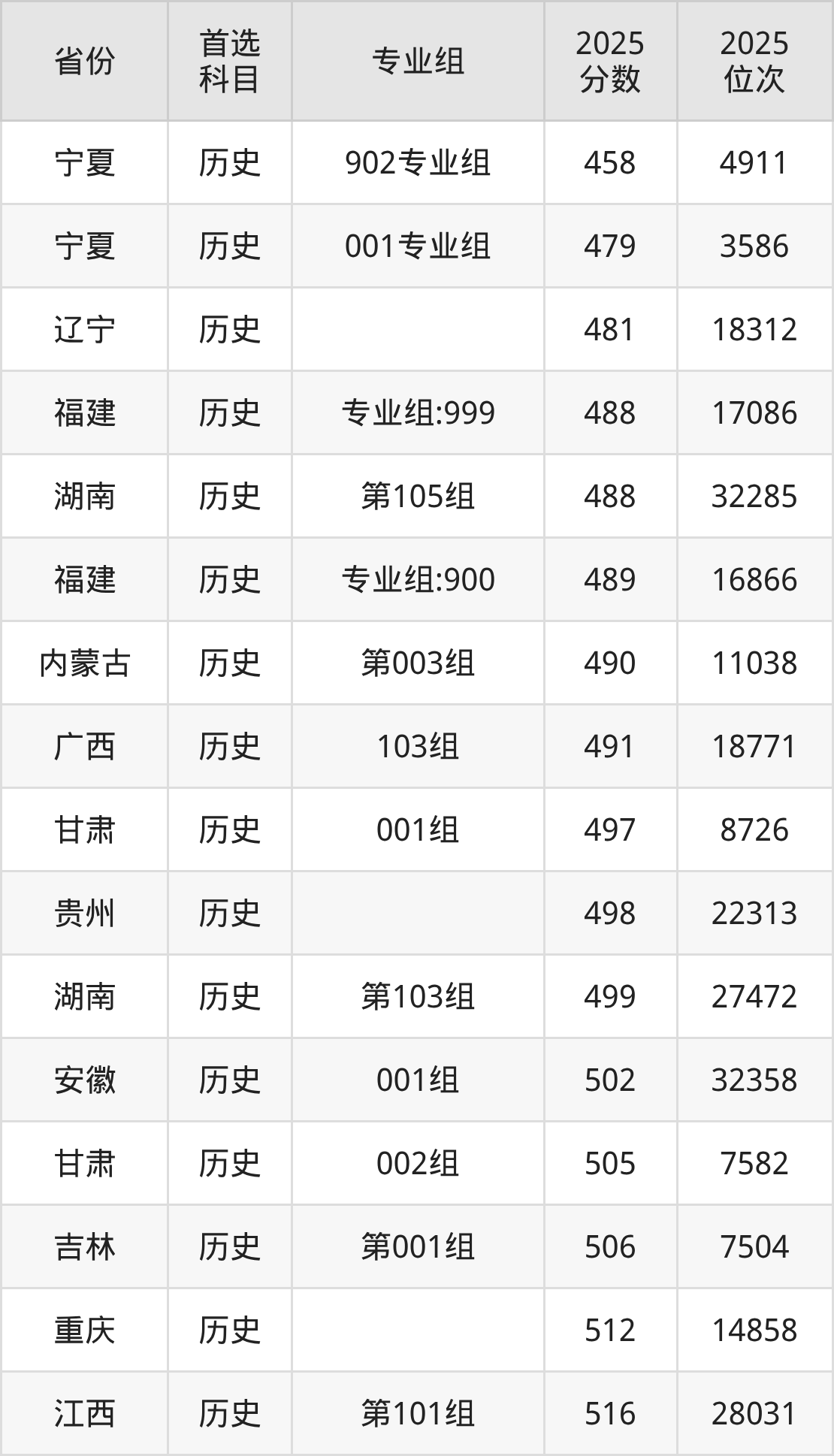历史类:专业组101533分、28339名,专业组102533分、28339名,专业组103536分、26727名,专业组104533分、28339名,专业组105542分、23750名,专业组106537分、26218名;