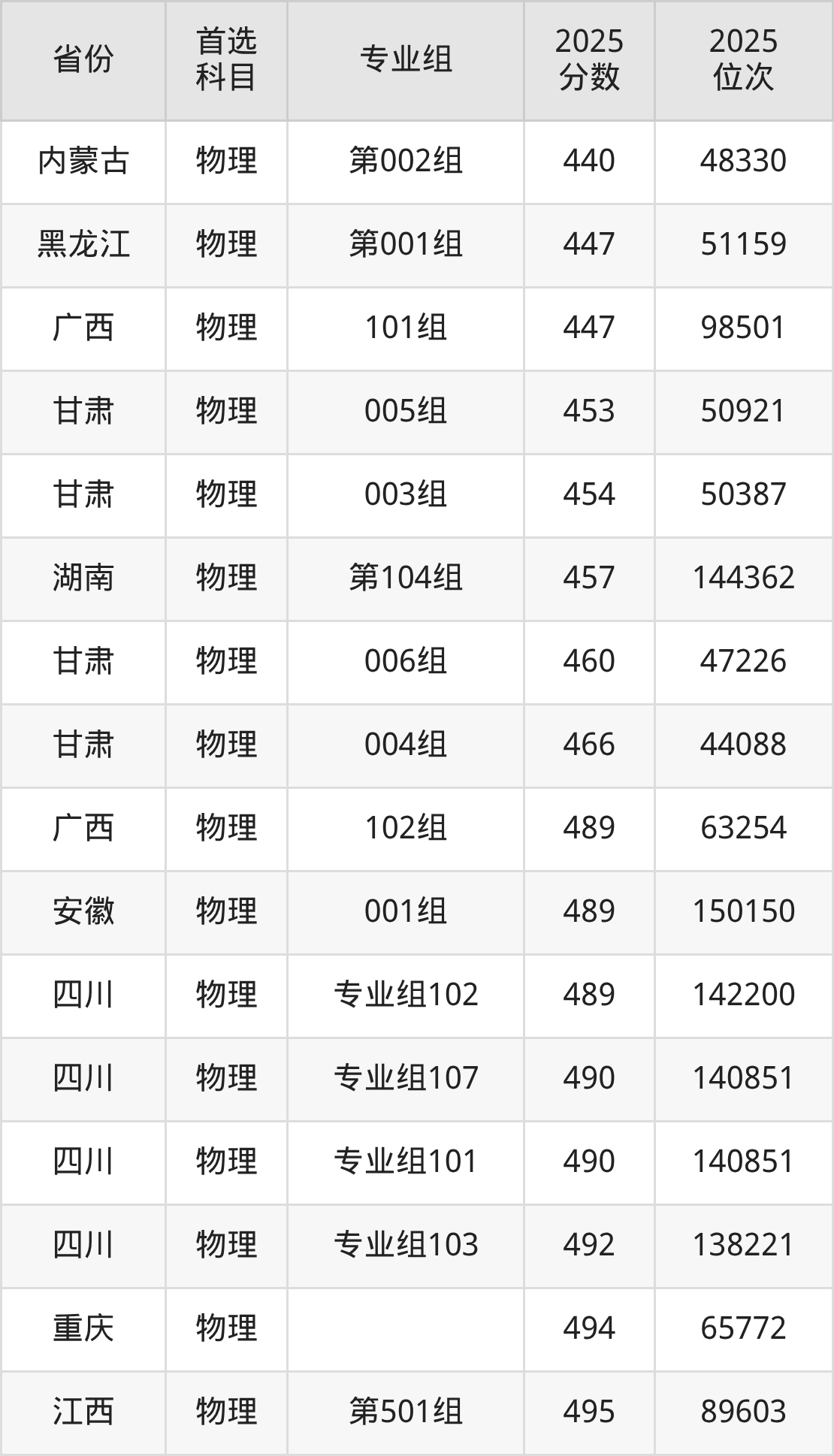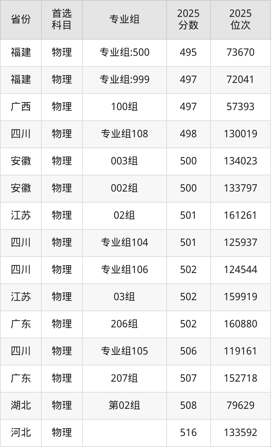 物理类:专业组101490分、140851名,专业组102489分、142200名,专业组103492分、138221名,专业组104501分、125937名,专业组105506分、119161名,专业组106502分、124544名,专业组107490分、140851名,专业组108498分、130019名;
