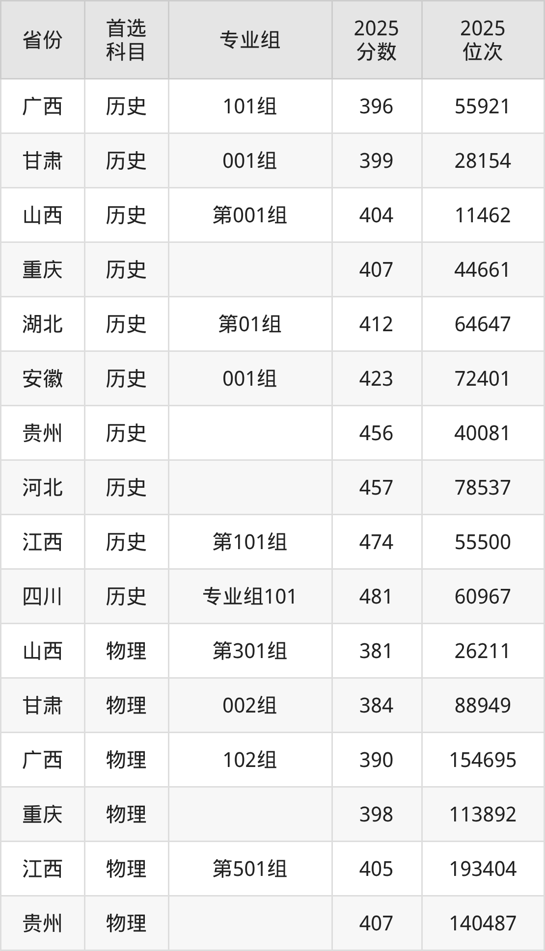 历史类最低分对应地区为广西(101组),录取位次为55921,超专科线196分;最高分对应地区为四川(专业组101),录取位次为60967,超专科线331分。