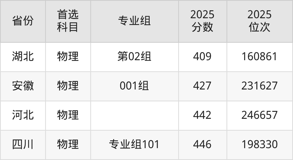 物理类最低分对应地区为山西(第301组),录取位次为26211,超专科线281分;最高分对应地区为四川(专业组101),录取位次为198330,超专科线296分。