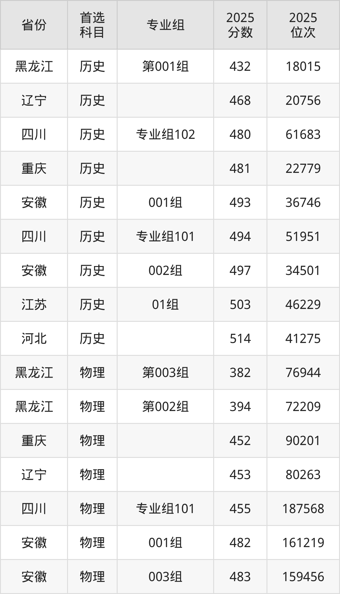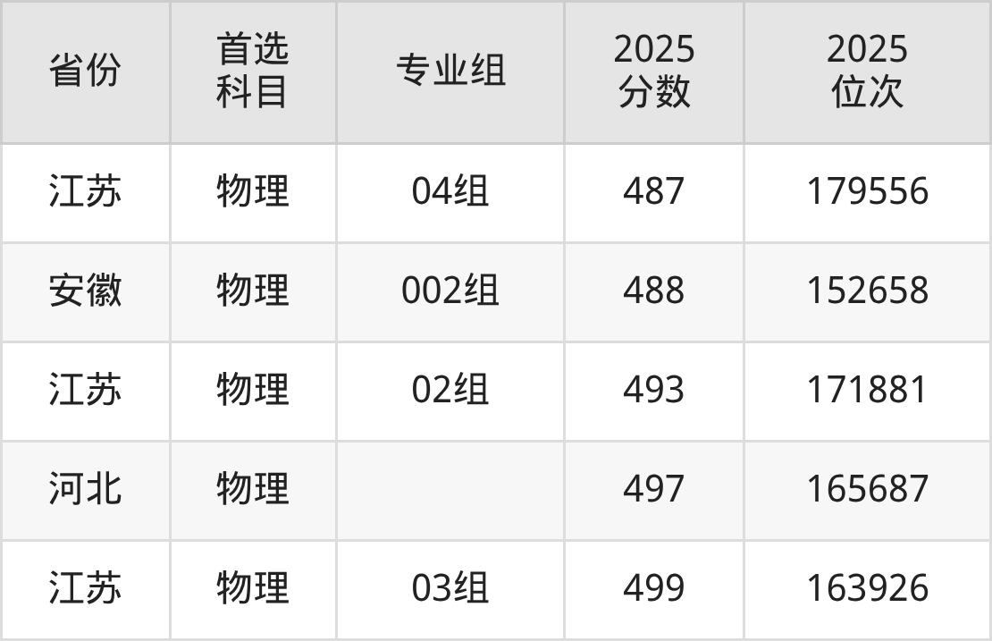 物理类最低分对应地区为黑龙江(第003组),录取位次为76944,超本科线22分;最高分对应地区为江苏(03组),录取位次为163926,超本科线36分。