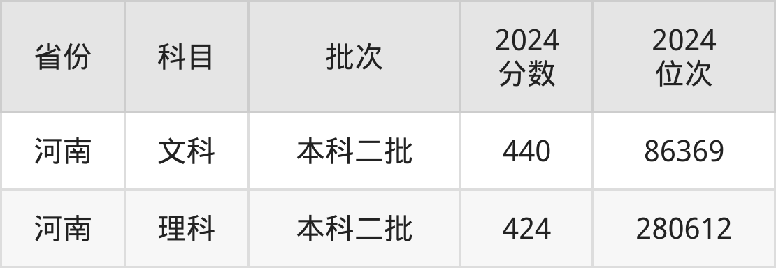 文科最低分对应地区为河南,录取位次为86369,超二本线12分。