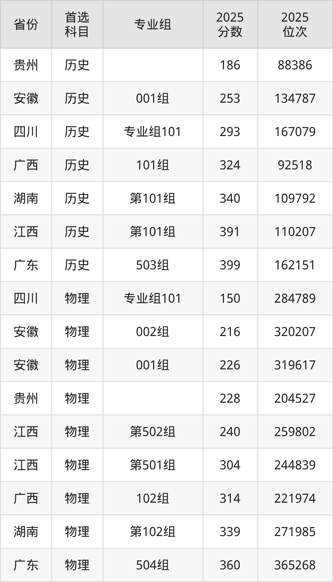 物理类最低分对应地区为四川(专业组101),录取位次为284789;最高分对应地区为广东(504组),录取位次为365268。