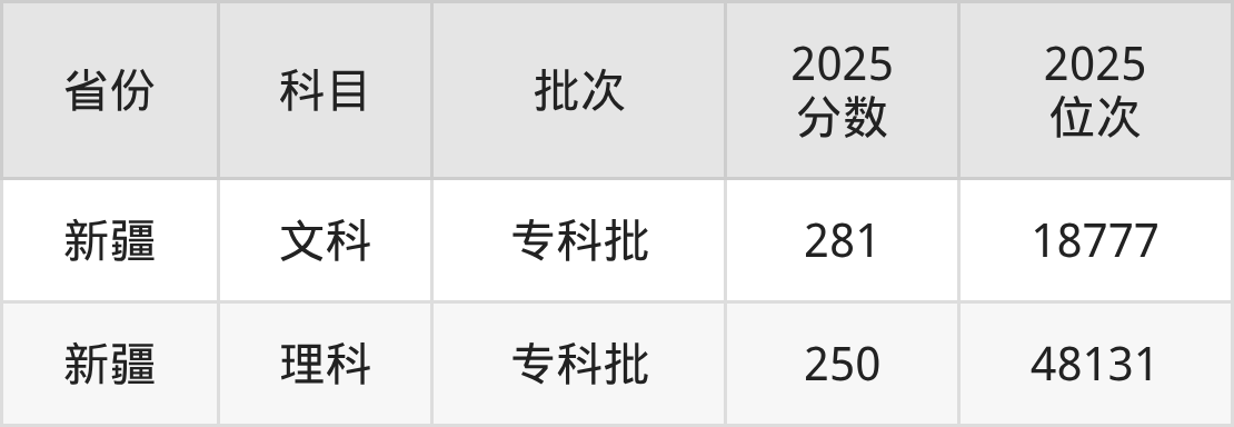 文科最低分对应地区为新疆,录取位次为18777,超专科线141分。