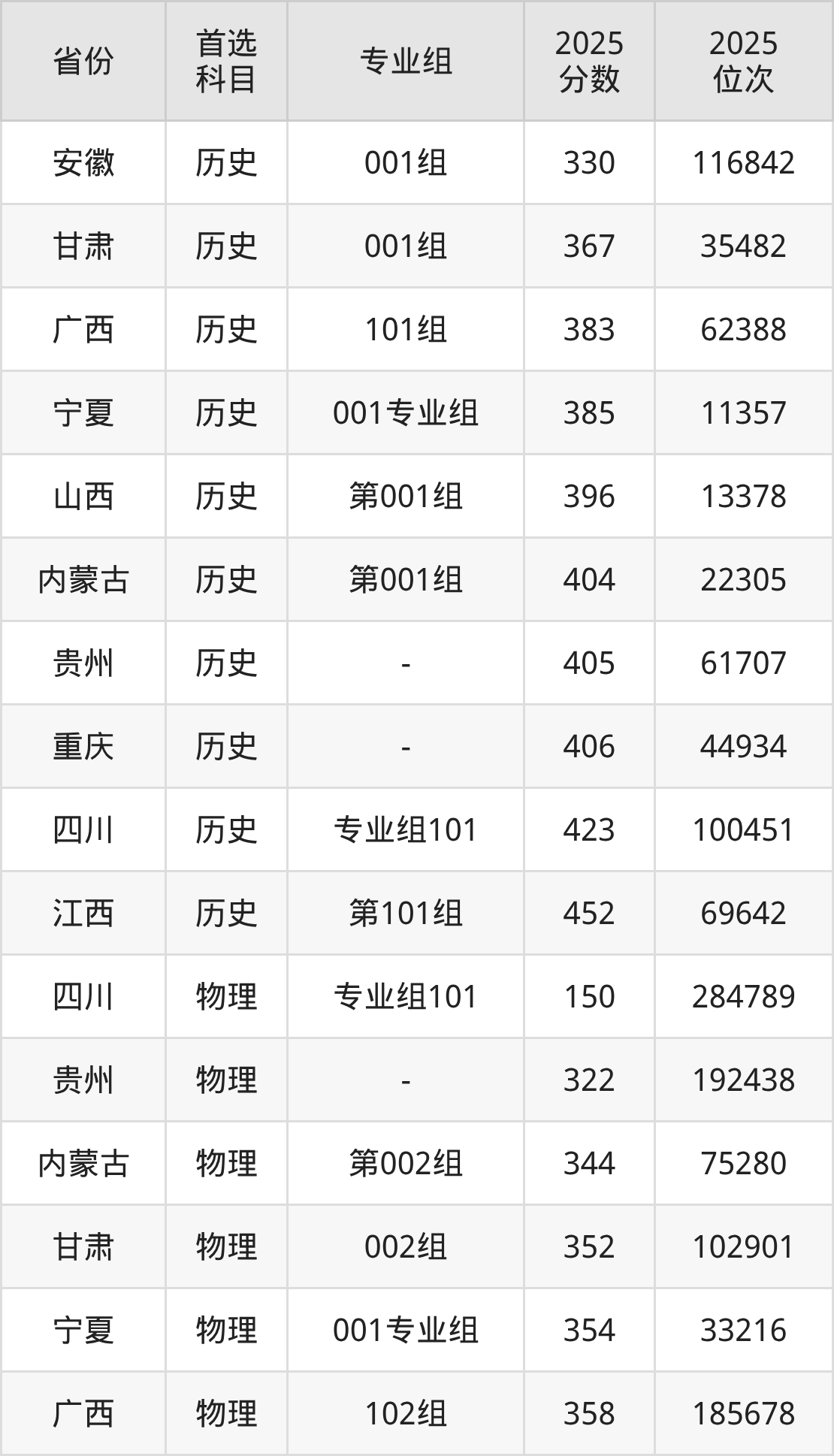历史类最低分对应地区为安徽(001组),录取位次为116842;最高分对应地区为江西(第101组),录取位次为69642,超专科线162分。
