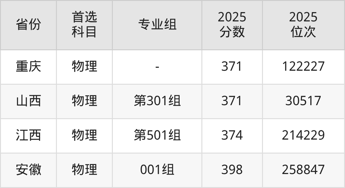 物理类最低分对应地区为四川(专业组101),录取位次为284789;最高分对应地区为安徽(001组),录取位次为258847,超专科线198分。